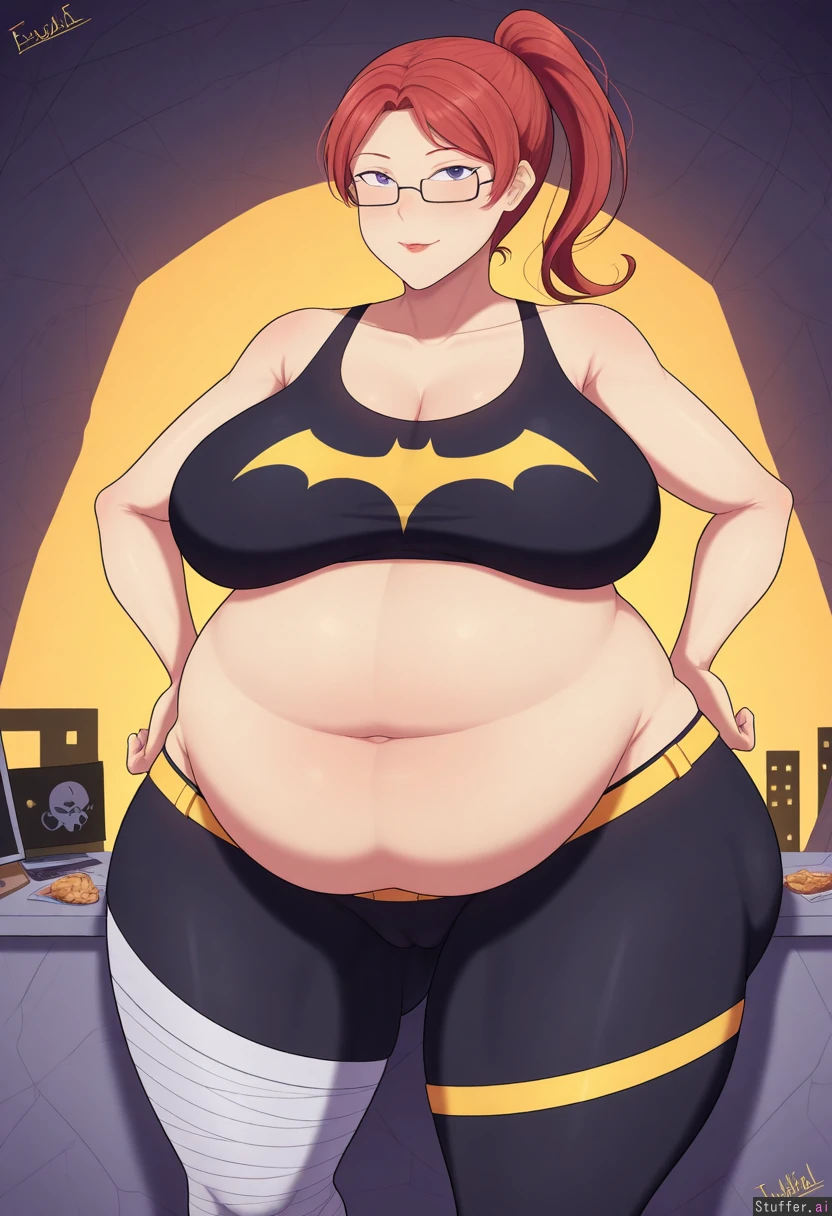 1girl, female, dc_comics, dc, batman_(series), no_cape, no_gloves, 1girl, tank_top, no_utility_belt, batgirl_(barbara_Gordon), (Barbara Gordon), batgirl, batgirl_(dc), no_mask, girl with blue eyes and red lipstick and red hair ponytail with bangs, female, blue_eyes, red_lipstick, long_hair, red_hair, bangs, redhead, mature_female, babe, hot body, pretty face, clothed_female, big_ass/butt/booty, front_side, front_view, forward_facing, gotham, cave, headquarters, batcave, large_computer, food_scraps, alone, solo, injured_leg, injury, bandaged_leg, leg_cast, wall_calender, blissful, empty_plate, food_wrapper, candy_wrapper, fast_food, thick_thighs, soft_arms, muffin_top, uterine_pouch, cameltoe, exposed_midriff, tight_yoga_pants, glasses, no_belt, bloated, touching_self, fat_arms, sitting, fat, fat_hips, fat_legs, chubby_cheeks, masturbating, obese ((leg_thickness:1.4)) ((hip_width:1.8)) ((butt_size:1.4)) ((boob_size:0.8)) ((chubby_belly:1.7))