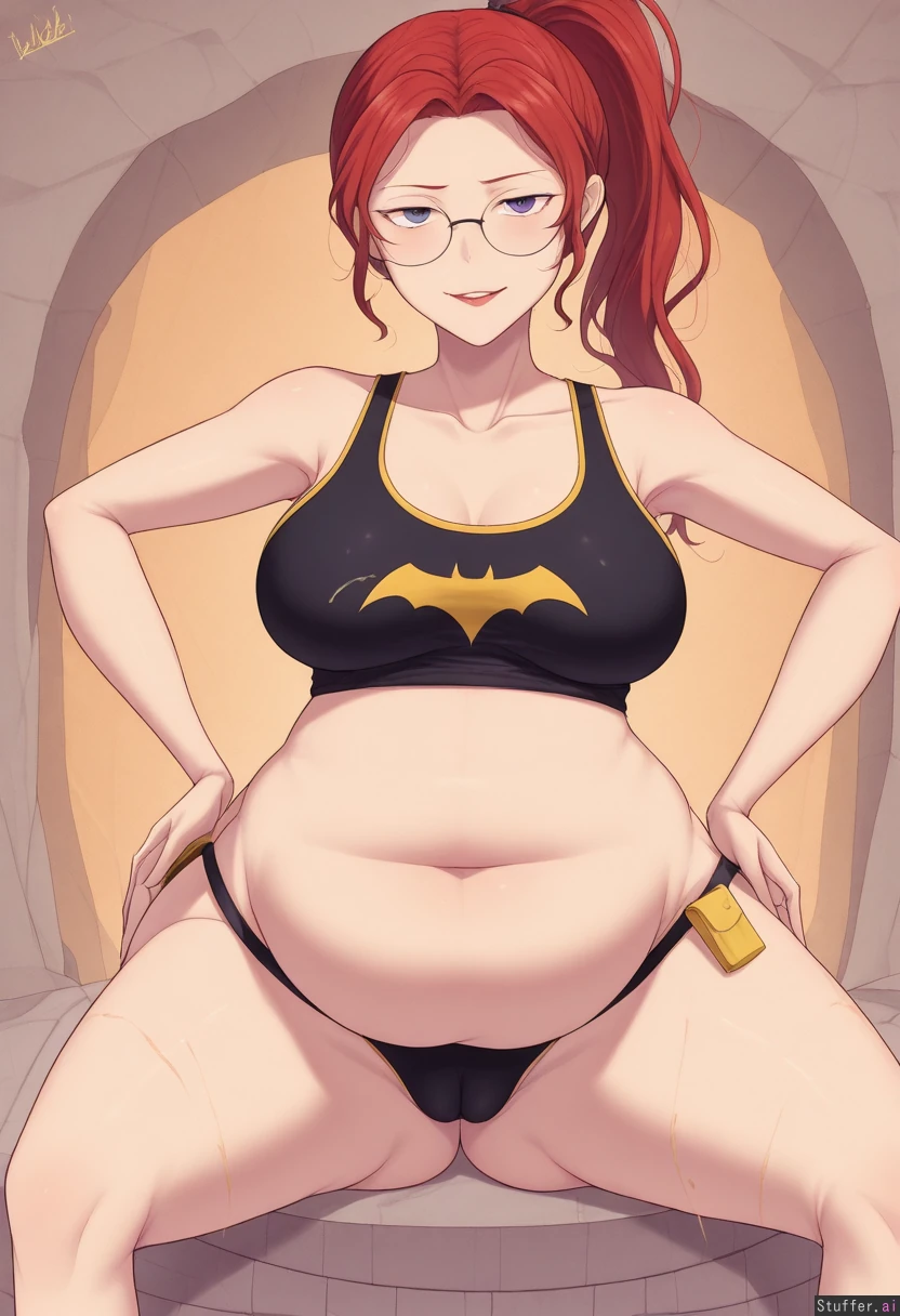 1girl, female, dc_comics, dc, batman_(series), no_cape, no_gloves, 1girl, tank_top, no_utility_belt, batgirl_(barbara_Gordon), (Barbara Gordon), batgirl, batgirl_(dc), no_mask, girl with blue eyes and red lipstick and red hair ponytail with bangs, female, blue_eyes, red_lipstick, long_hair, red_hair, bangs, redhead, mature_female, babe, hot body, pretty face, clothed_female, big_ass/butt/booty, front_side, front_view, forward_facing, gotham, cave, headquarters, batcave, large_computer, food_scraps, alone, solo, injured_leg, injury, bandaged_leg, leg_cast, wall_calender, blissful, empty_plate, food_wrapper, candy_wrapper, fast_food, thick_thighs, soft_arms, muffin_top, uterine_pouch, cameltoe, exposed_midriff, glasses, no_belt, bloated, touching_self, fat_arms, sitting, fat, fat_hips, fat_legs, chubby_cheeks, masturbating, pleasure, cumming ((leg_thickness:1.4)) ((hip_width:1.8)) ((butt_size:1.4)) ((boob_size:0.8)) ((chubby_belly:1.7))