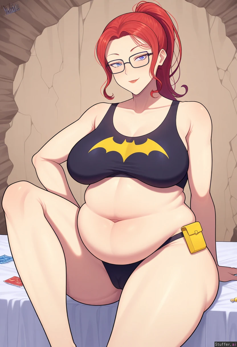 1girl, female, dc_comics, dc, batman_(series), no_cape, no_gloves, 1girl, tank_top, no_utility_belt, batgirl_(barbara_Gordon), (Barbara Gordon), batgirl, batgirl_(dc), no_mask, girl with blue eyes and red lipstick and red hair ponytail with bangs, female, blue_eyes, red_lipstick, long_hair, red_hair, bangs, redhead, mature_female, babe, hot body, pretty face, clothed_female, big_ass/butt/booty, front_side, front_view, forward_facing, gotham, cave, headquarters, batcave, food_scraps, alone, solo, wall_calender, blissful, empty_plate, food_wrapper, candy_wrapper, fast_food, thick_thighs, soft_arms, muffin_top, uterine_pouch, cameltoe, exposed_midriff, glasses, no_belt, bloated, touching_self, fat_arms, sitting, fat, chubby_cheeks, masturbating, pleasure, cumming, on_bed, horny, nude ((leg_thickness:1.4)) ((hip_width:1.8)) ((butt_size:1.4)) ((boob_size:0.8)) ((chubby_belly:1.7))