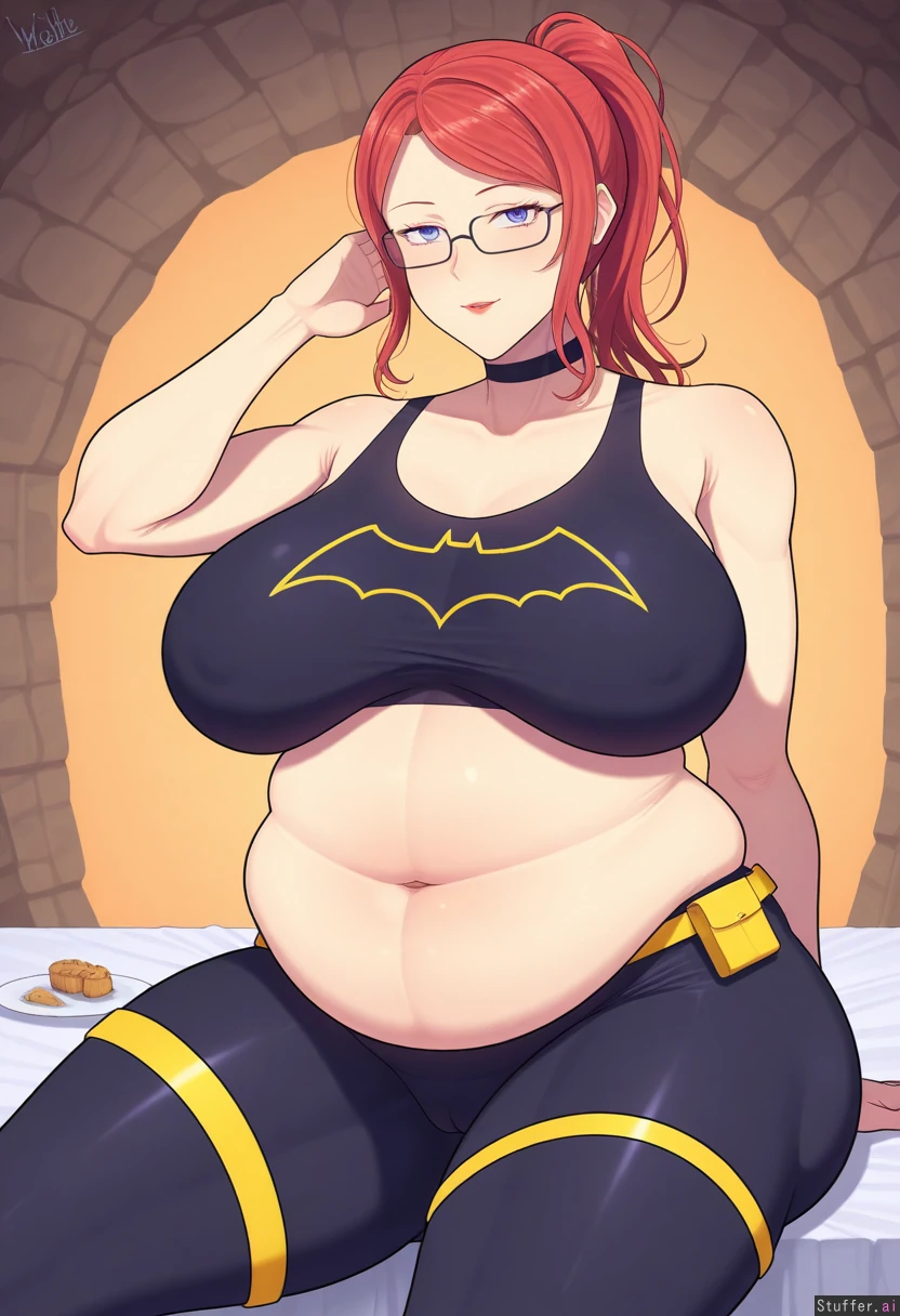 1girl, female, dc_comics, dc, batman_(series), no_cape, no_gloves, 1girl, tank_top, no_utility_belt, batgirl_(barbara_Gordon), (Barbara Gordon), batgirl, batgirl_(dc), no_mask, girl with blue eyes and red lipstick and red hair ponytail with bangs, female, blue_eyes, red_lipstick, long_hair, red_hair, bangs, redhead, mature_female, babe, hot body, pretty face, clothed_female, big_ass/butt/booty, front_side, front_view, forward_facing, gotham, cave, headquarters, batcave, food_scraps, alone, solo, wall_calender, blissful, empty_plate, food_wrapper, candy_wrapper, fast_food, thick_thighs, soft_arms, muffin_top, uterine_pouch, cameltoe, exposed_midriff, glasses, no_belt, bloated, touching_self, fat_arms, sitting, fat, chubby_cheeks, masturbating, pleasure, cumming, on_bed, horny, nude, fat_rolls, ((leg_thickness:1.6)) ((hip_width:2)) ((butt_size:1.6)) ((boob_size:0.9)) ((chubby_belly:1.9))