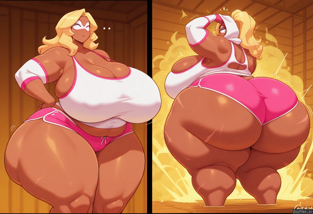 (solo, small head, (carmessi(artist):1.8)), ((hyper female hyper thick hyper obese adult body:2.4), (((gigantic colossal hyper expansion hyper obese thick (hyper huge ass_bigger_than_body):4), hyper thick hyper huge hyper wide hyper thick ((hyper obese hyper sexy hyper huge_ass):3.2))), (massive fart), ((((hyper overweight tall adult female milf spider-gwen, skimpy white and pink gym shorts and gym tanktop, tanned skin, spider-gwen mask no mouth, no pupils, slutty eyeshadow, blonde hair, no gloves, scars across body, giant yellow pubic_hair_peek, giant yellow armpit_hair)))), ((seductively standing squeezing her body in hot sauna:1.4, slutty eyeshadow, too hot and bothered)), (((side view))),