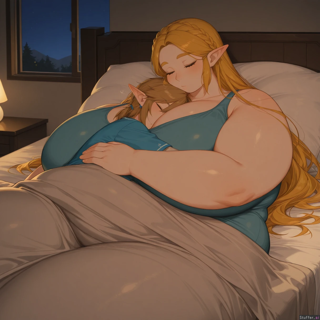 uhd, high resolution, flawless, best_quality, (usa37107692\(artist\):1.0), link (the legend of zelda), zelda (the legend of zelda), breath of the wild, botw, link x zelda, zelink, 1boy, 1girl, couple, hugging, cuddle, cuddling, embrace, lying, lying on bed, bed, indoors, bedroom, cozy, soft lighting, warm lighting, intimate, peaceful, relaxed, sleeping together, resting, blanket, sheets, pillow, close, affectionate, tender, calm atmosphere, night, quiet, comfort, together, side by side (morbidly_obese_girl:1.0), (Fat Arms:1.0), (gigantic_fat_thighs:1.0), (tall female), (gigantic sagging breasts), (enormous wide hips:1.0), (size diffrence:1.2), fully_clothed,