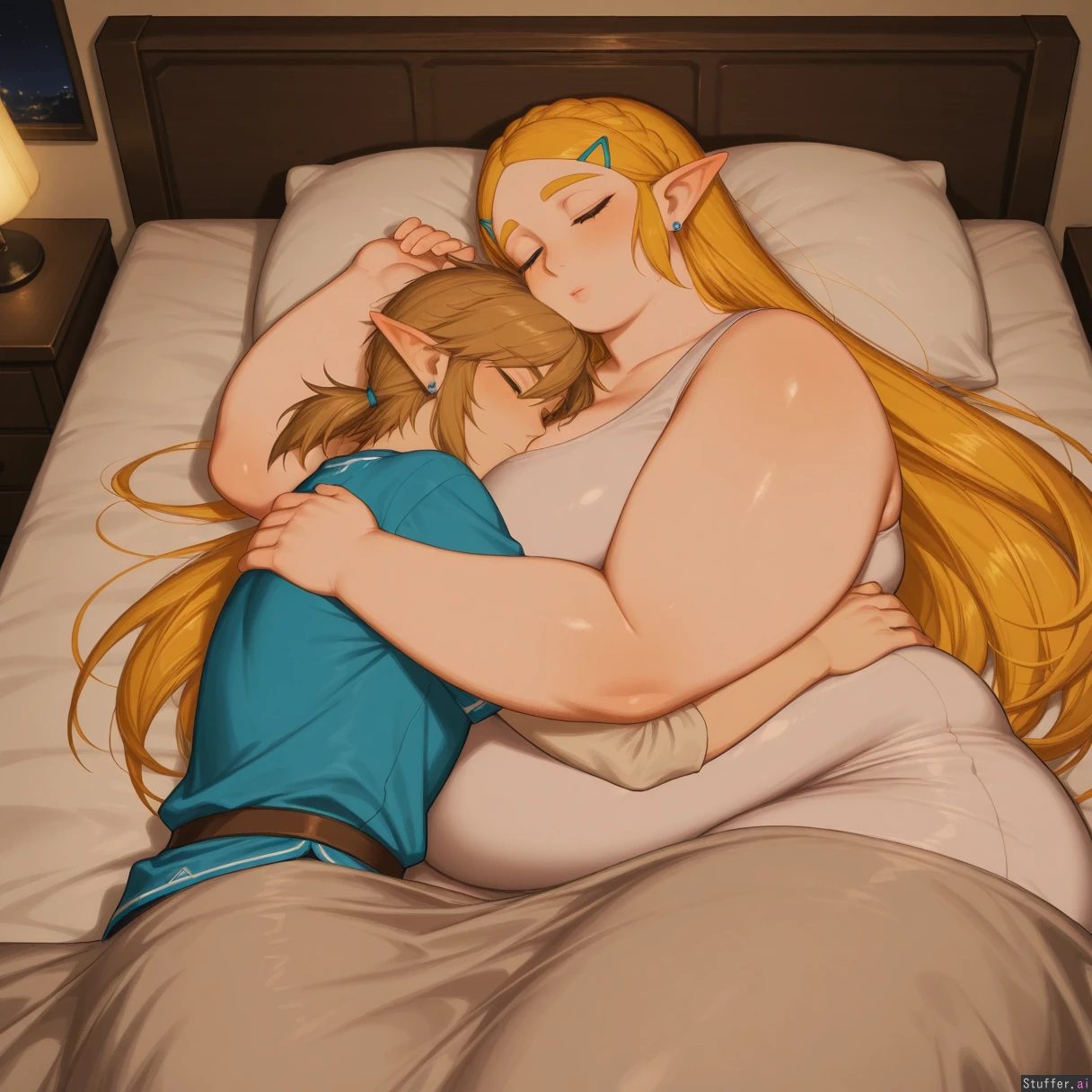 uhd, high resolution, flawless, best_quality, ({wamudraws:1.4|kittew:1.4|KAMII_MOMORU:1.4|usa37107692|lineless:1.8|bluethebone:1.2|fizintine:1.2|flipherrrr:1.2|pixel_art pixel_(artwork):1.3|constellor:1.4|pantsu-ripper:1.2|combos_&_doodles:1.2|maru_ccy:1.4|chomikuplus:1.4|Noblood:1.4|zyugoya|merunyaa:1.4|partially_colored, colored pencil sketch:1.4}) link (the legend of zelda), zelda (the legend of zelda), breath of the wild, botw, link x zelda, zelink, 1boy, 1girl, couple, hugging, cuddle, cuddling, embrace, lying, lying on bed, bed, indoors, bedroom, cozy, soft lighting, warm lighting, intimate, peaceful, relaxed, sleeping together, resting, blanket, sheets, pillow, close, affectionate, tender, calm atmosphere, night, quiet, comfort, together, side by side (morbidly_obese_girl:1.0), (Fat Arms:1.0), (gigantic_fat_thighs:1.0), (tall female), (gigantic sagging breasts), (enormous wide hips:1.0), (size diffrence:1.2), fully_clothed,
