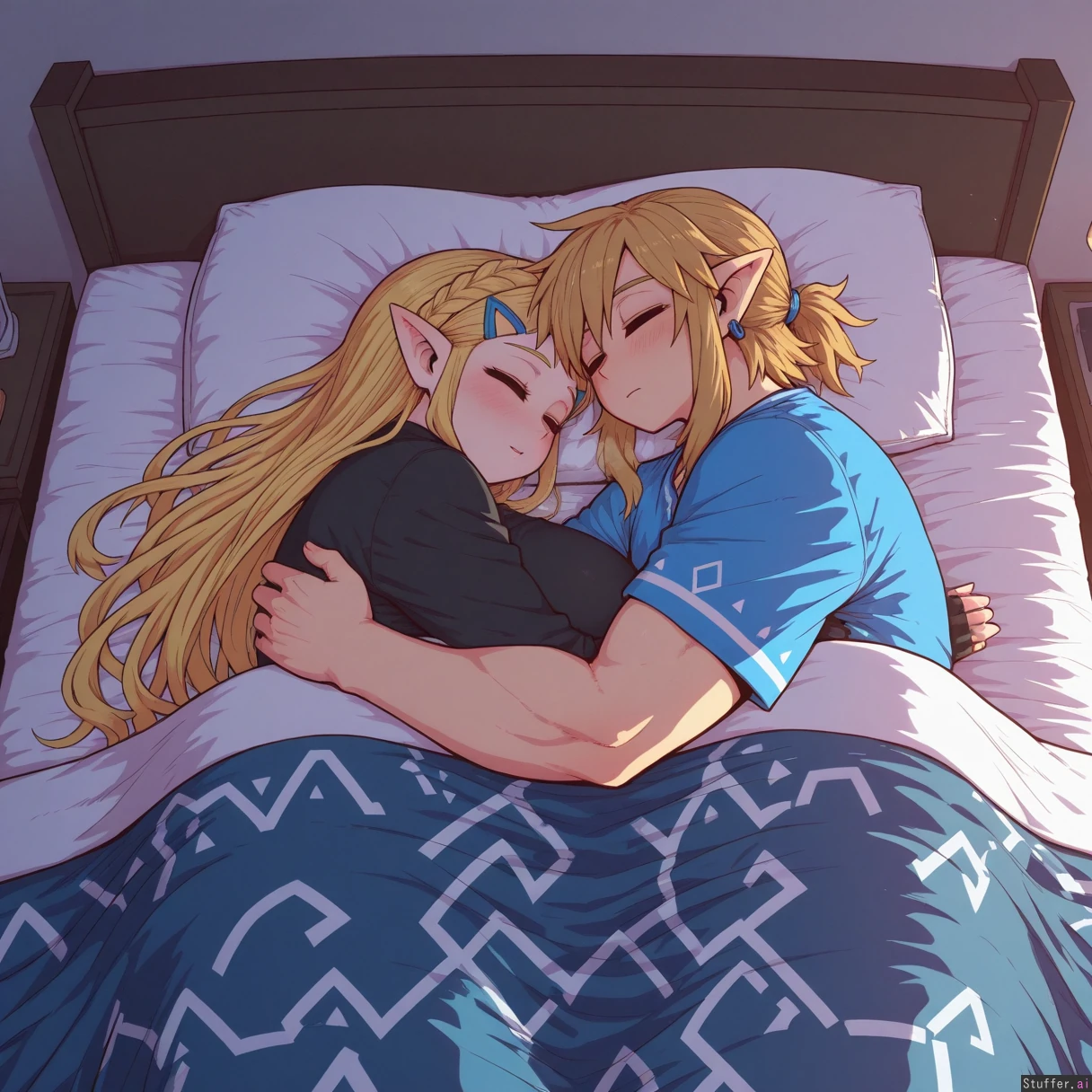 uhd, high resolution, flawless, best_quality, (zyugoya) link (the legend of zelda), zelda (the legend of zelda), breath of the wild, botw, link x zelda, zelink, 1boy, 1girl, couple, hugging, cuddle, cuddling, embrace, lying, lying on bed, bed, indoors, bedroom, cozy, soft lighting, warm lighting, intimate, peaceful, relaxed, sleeping together, resting, blanket, sheets, pillow, close, affectionate, tender, calm atmosphere, night, quiet, comfort, together, side by side (morbidly_obese_girl:1.0), (Fat Arms:1.0), (gigantic_fat_thighs:1.0), (tall female), (gigantic sagging breasts), (enormous wide hips:1.0), (size diffrence:1.2), fully_clothed,