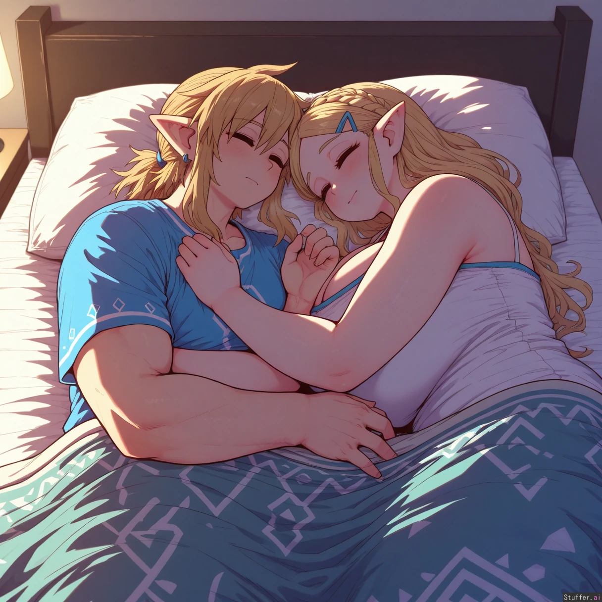 uhd, high resolution, flawless, best_quality, (zyugoya) link (the legend of zelda), zelda (the legend of zelda), breath of the wild, botw, link x zelda, zelink, 1boy, 1girl, couple, hugging, cuddle, cuddling, embrace, lying, lying on bed, bed, indoors, bedroom, cozy, soft lighting, warm lighting, intimate, peaceful, relaxed, sleeping together, resting, blanket, sheets, pillow, close, affectionate, tender, calm atmosphere, night, quiet, comfort, together, side by side (morbidly_obese_girl:1.0), (Fat Arms:1.0), (gigantic_fat_thighs:1.0), (tall female), (gigantic sagging breasts), (enormous wide hips:1.0), (size diffrence:1.2), fully_clothed,