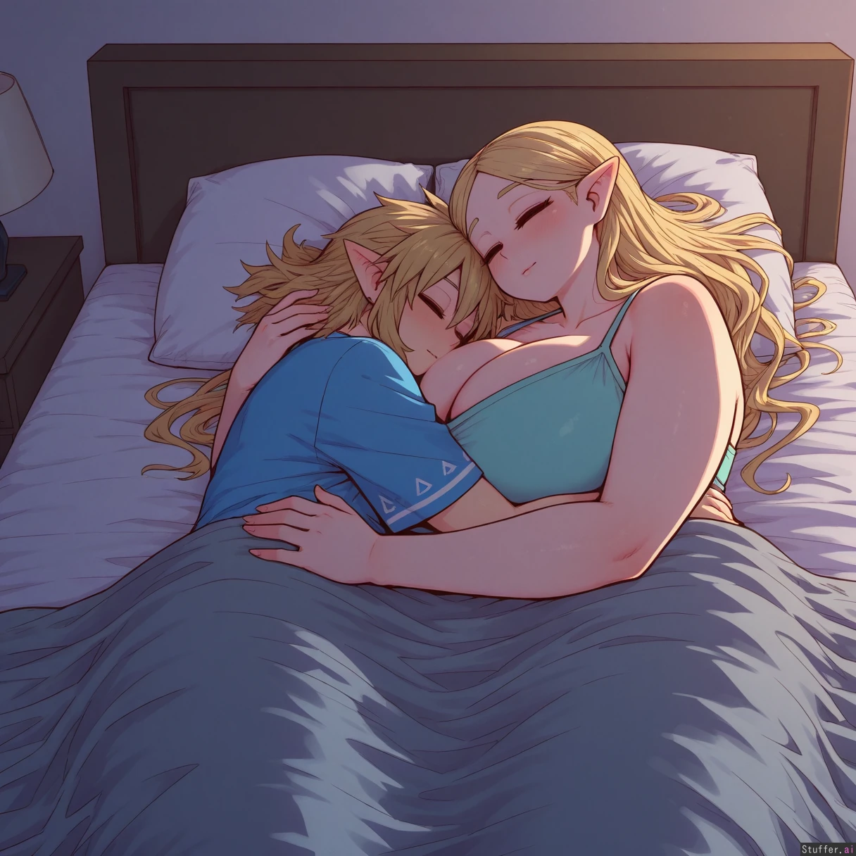 uhd, high resolution, flawless, best_quality, (zyugoya) link (the legend of zelda), zelda (the legend of zelda), breath of the wild, botw, link x zelda, zelink, 1boy, 1girl, couple, hugging, cuddle, cuddling, embrace, lying, lying on bed, bed, indoors, bedroom, cozy, soft lighting, warm lighting, intimate, peaceful, relaxed, sleeping together, resting, blanket, sheets, pillow, close, affectionate, tender, calm atmosphere, night, quiet, comfort, together, side by side (morbidly_obese_girl:1.0), (Fat Arms:1.0), (gigantic_fat_thighs:1.0), (tall female), (gigantic sagging breasts), (enormous wide hips:1.0), (size diffrence:1.2), fully_clothed,