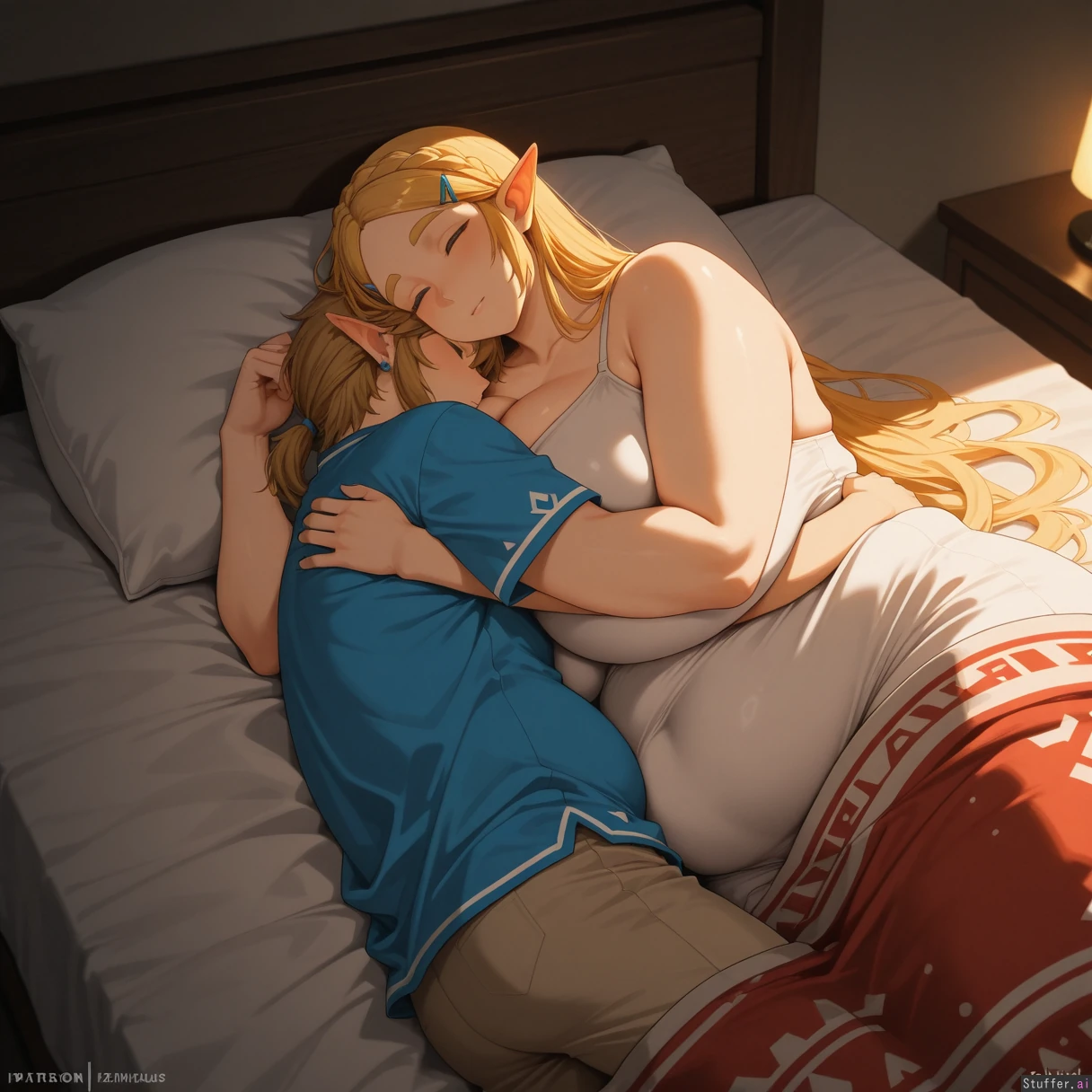 uhd, high resolution, flawless, best_quality, (chomikuplus) link (the legend of zelda), zelda (the legend of zelda), breath of the wild, botw, link x zelda, zelink, 1boy, 1girl, couple, hugging, cuddle, cuddling, embrace, lying, lying on bed, bed, indoors, bedroom, cozy, soft lighting, warm lighting, intimate, peaceful, relaxed, sleeping together, resting, blanket, sheets, pillow, close, affectionate, tender, calm atmosphere, night, quiet, comfort, together, side by side (morbidly_obese_girl:1.2), (Fat Arms:1.0), (gigantic_fat_thighs:1.0), (tall female), (gigantic sagging breasts), (enormous wide hips:1.0), (size diffrence:1.2), fully_clothed,