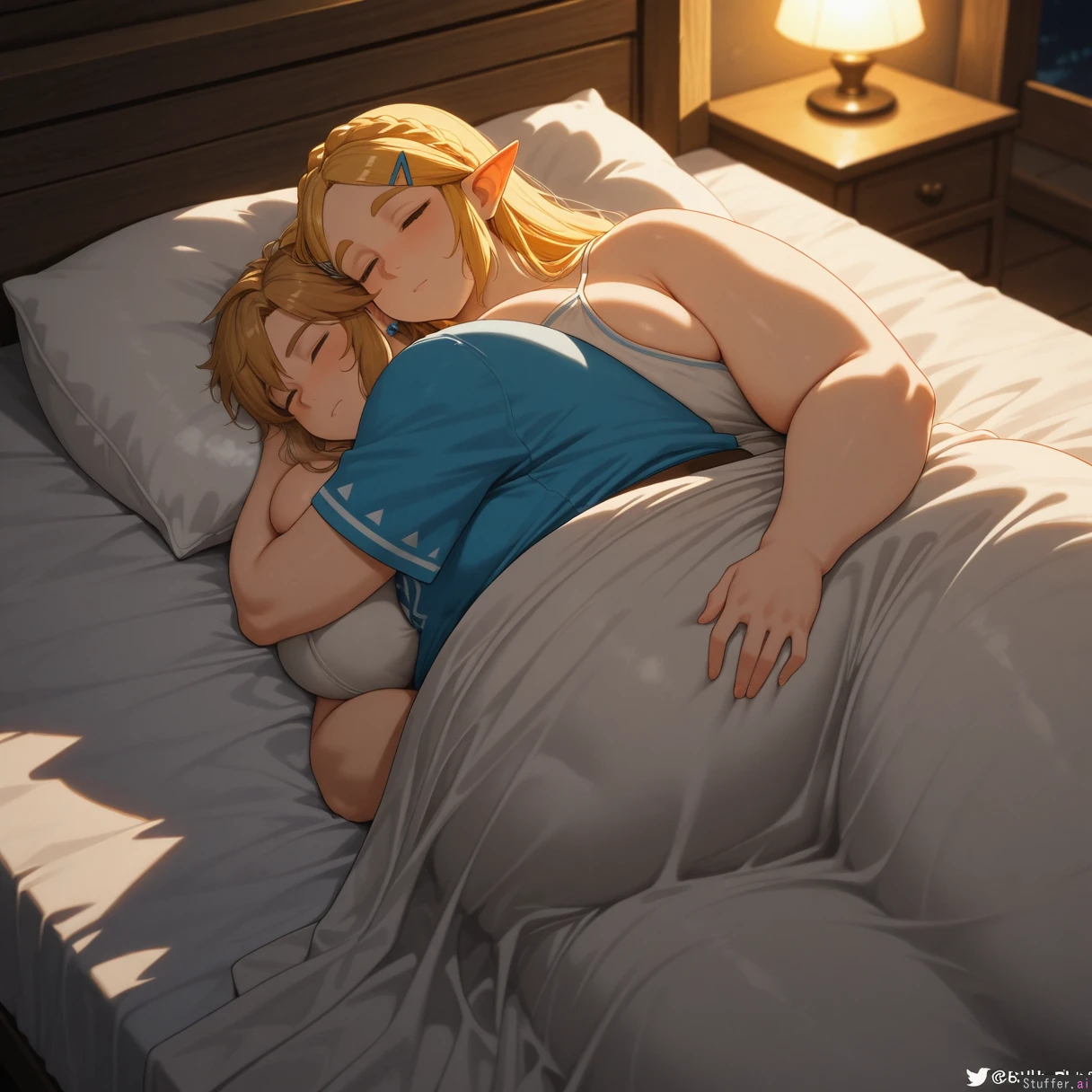 uhd, high resolution, flawless, best_quality, (chomikuplus) link (the legend of zelda), zelda (the legend of zelda), breath of the wild, botw, link x zelda, zelink, 1boy, 1girl, couple, hugging, cuddle, cuddling, embrace, lying, lying on bed, bed, indoors, bedroom, cozy, soft lighting, warm lighting, intimate, peaceful, relaxed, sleeping together, resting, blanket, sheets, pillow, close, affectionate, tender, calm atmosphere, night, quiet, comfort, together, side by side (morbidly_obese_girl:1.2), (Fat Arms:1.0), (gigantic_fat_thighs:1.0), (tall female), (gigantic sagging breasts), (enormous wide hips:1.0), (size diffrence:1.2), fully_clothed,