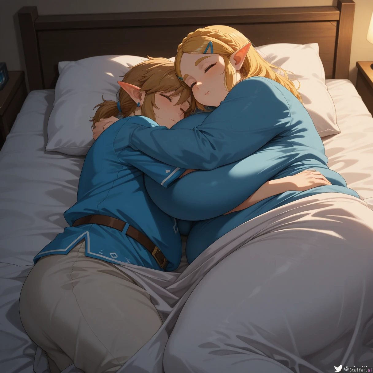 uhd, high resolution, flawless, best_quality, (chomikuplus) link (the legend of zelda), zelda (the legend of zelda), breath of the wild, botw, link x zelda, zelink, 1boy, 1girl, couple, hugging, cuddle, cuddling, embrace, lying, lying on bed, bed, indoors, bedroom, cozy, soft lighting, warm lighting, intimate, peaceful, relaxed, sleeping together, resting, blanket, sheets, pillow, close, affectionate, tender, calm atmosphere, night, quiet, comfort, together, side by side (morbidly_obese_girl:1.2), (Fat Arms:1.0), (gigantic_fat_thighs:1.0), (tall female), (gigantic sagging breasts), (enormous wide hips:1.0), (size diffrence:1.2), fully_clothed,
