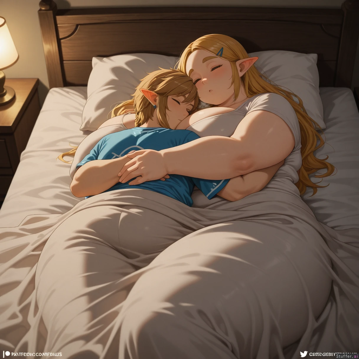 uhd, high resolution, flawless, best_quality, (chomikuplus) link (the legend of zelda), zelda (the legend of zelda), breath of the wild, botw, link x zelda, zelink, 1boy, 1girl, couple, hugging, cuddle, cuddling, embrace, lying, lying on bed, bed, indoors, bedroom, cozy, soft lighting, warm lighting, intimate, peaceful, relaxed, sleeping together, resting, blanket, sheets, pillow, close, affectionate, tender, calm atmosphere, night, quiet, comfort, together, side by side (morbidly_obese_girl:1.2), (Fat Arms:1.0), (gigantic_fat_thighs:1.0), (tall female), (gigantic sagging breasts), (enormous wide hips:1.0), (size diffrence:1.2), fully_clothed,