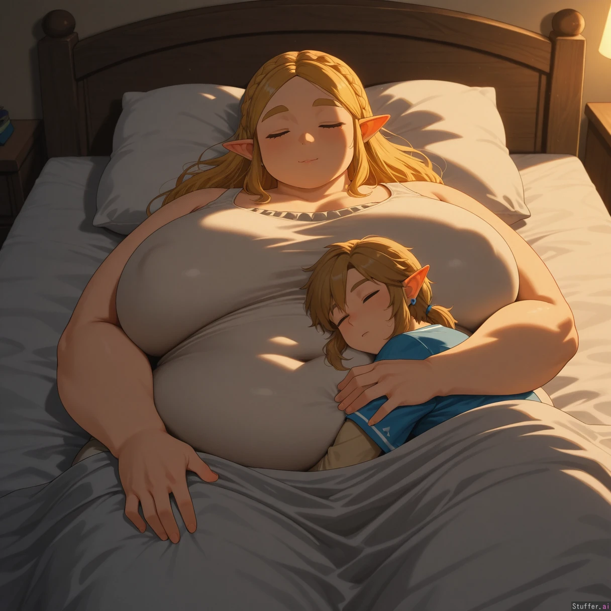 uhd, high resolution, flawless, best_quality, (chomikuplus) link (the legend of zelda), zelda (the legend of zelda), breath of the wild, botw, link x zelda, zelink, 1boy, 1girl, couple, hugging, cuddle, cuddling, embrace, lying, lying on bed, bed, indoors, bedroom, cozy, soft lighting, warm lighting, intimate, peaceful, relaxed, sleeping together, resting, blanket, sheets, pillow, close, affectionate, tender, calm atmosphere, night, quiet, comfort, together, side by side (morbidly_obese_girl:1.2), (Fat Arms:1.0), (gigantic_fat_thighs:1.0), (tall female), (gigantic sagging breasts), (enormous wide hips:1.0), (size diffrence:1.2), fully_clothed,