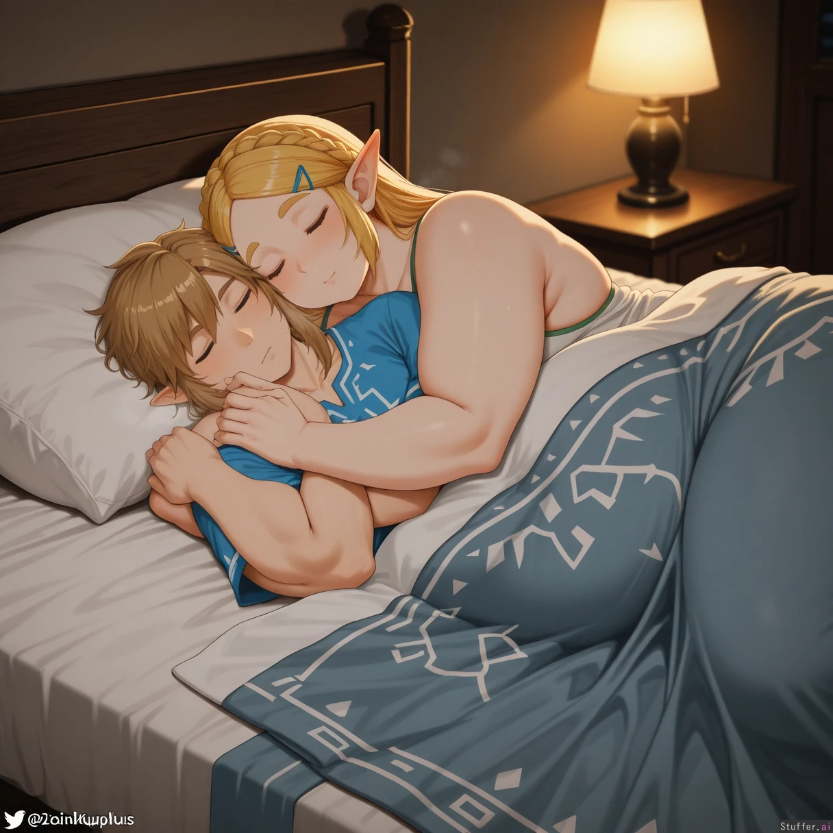 uhd, high resolution, flawless, best_quality, (chomikuplus:1.4) link (the legend of zelda), zelda (the legend of zelda), breath of the wild, botw, link x zelda, zelink, 1boy, 1girl, couple, hugging, cuddle, cuddling, embrace, lying, lying on bed, bed, indoors, bedroom, cozy, soft lighting, warm lighting, intimate, peaceful, relaxed, sleeping together, resting, blanket, sheets, pillow, close, affectionate, tender, calm atmosphere, night, quiet, comfort, together, side by side (morbidly_obese_girl:1.2), (Fat Arms:1.0), (gigantic_fat_thighs:1.0), (tall female), (gigantic sagging breasts), (enormous wide hips:1.0), (size diffrence:1.2), fully_clothed,