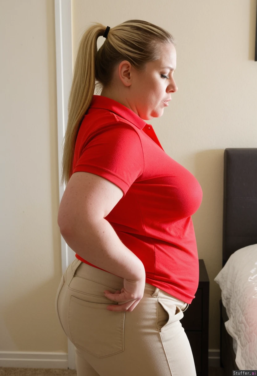 A sexy 34 year old millennial, getting ready for work, blonde hair in a ponytail, fitted red work polo shirt, beige jeans, bbw, fast_food_employee, (gross poor bedroom), midlife crisis, ugly, (side view), getting ready, looking at herself depressed, grossed out by her body, ((repulsed at herself))