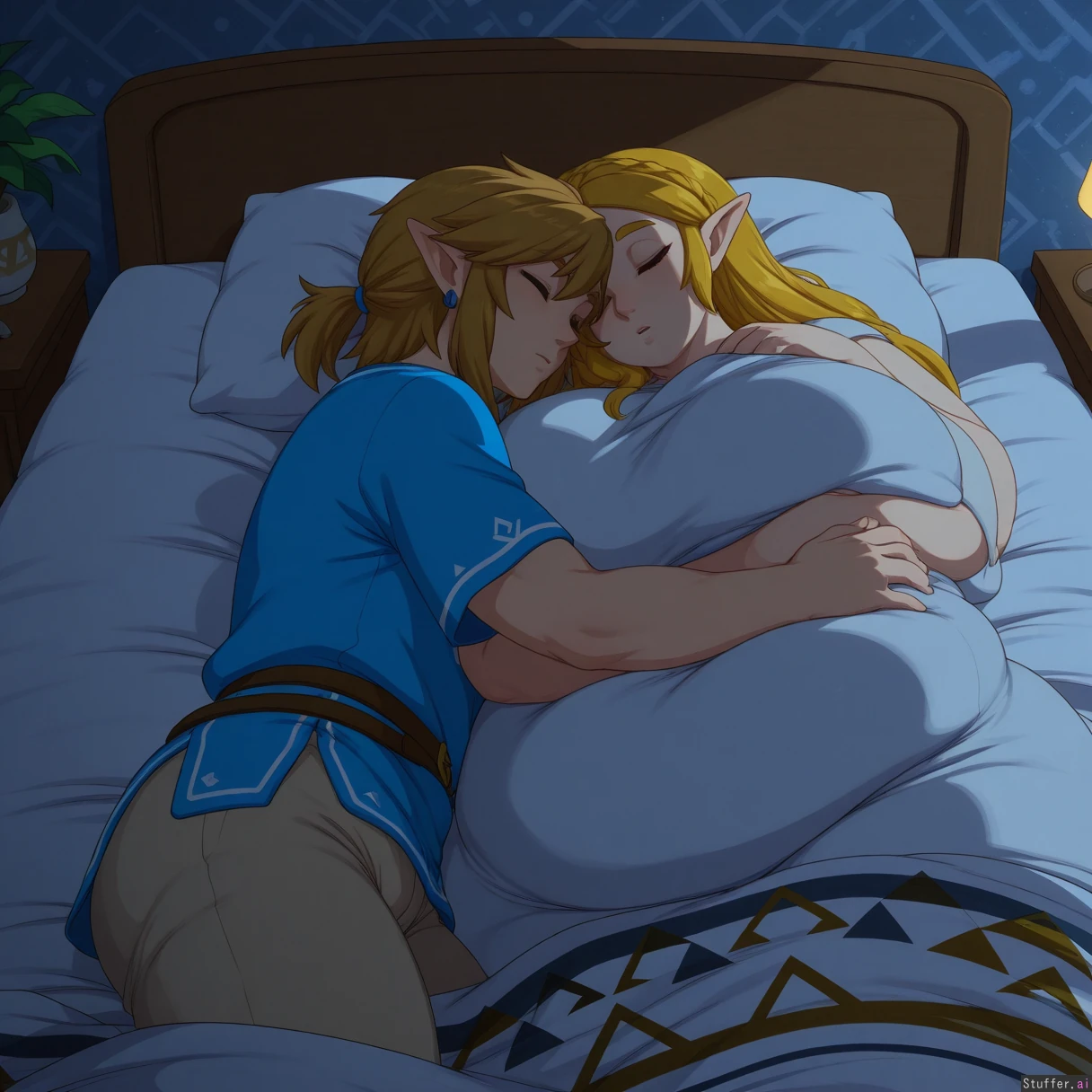 uhd, high resolution, flawless, best_quality, (merunyaa:1.4) link (the legend of zelda), zelda (the legend of zelda), breath of the wild, botw, link x zelda, zelink, 1boy, 1girl, couple, hugging, cuddle, cuddling, embrace, lying, lying on bed, bed, indoors, bedroom, cozy, soft lighting, warm lighting, intimate, peaceful, relaxed, sleeping together, resting, blanket, sheets, pillow, close, affectionate, tender, calm atmosphere, night, quiet, comfort, together, side by side (morbidly_obese_girl:1.4), (Fat Arms:1.0), (gigantic_fat_thighs:1.0), (tall female), (gigantic sagging breasts), (enormous wide hips:1.0), (size diffrence:1.2), fully_clothed,