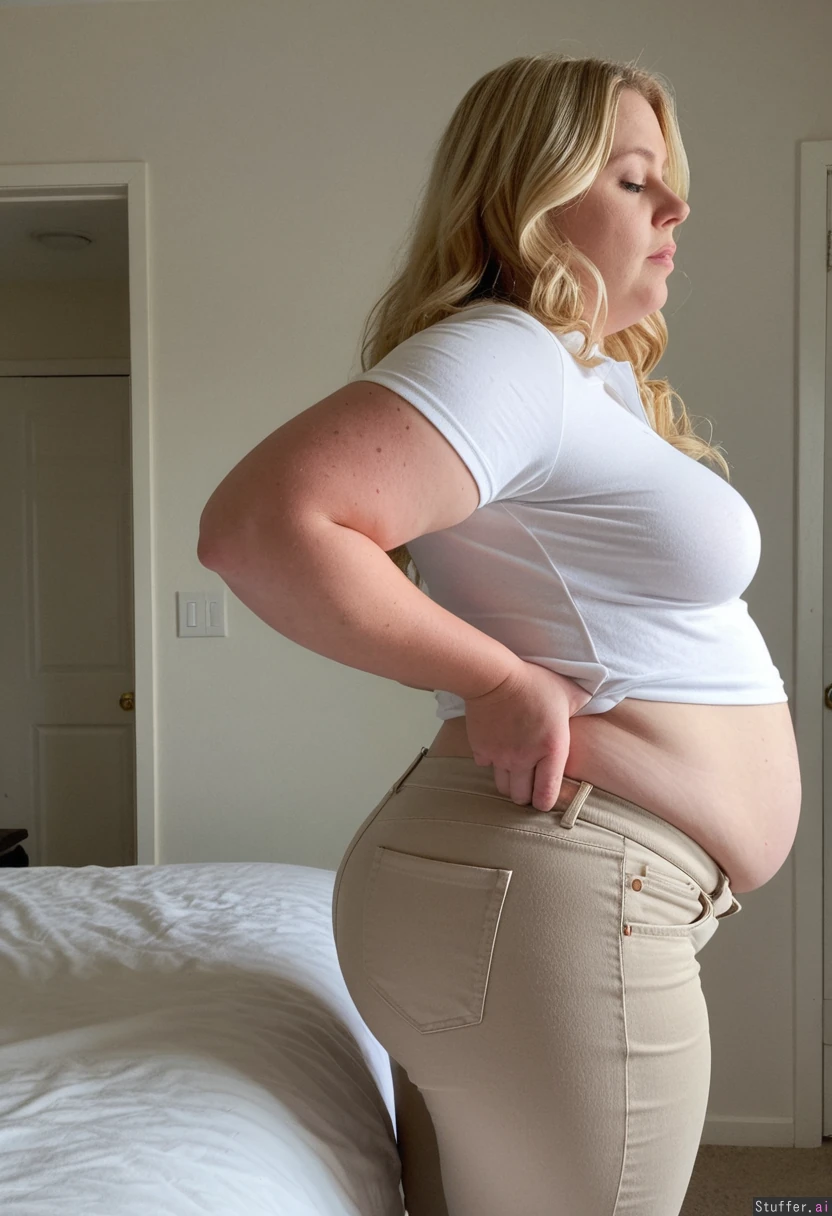Cute Swedish 34 year old millennial, former influencer model turned gross fatty, body positive, getting ready for work, cute blonde long wavy hair, fitted white work polo shirt, beige jeans, bbw, fat plump, fast_food_employee, (dingy bedroom), midlife crisis, (side view), getting ready, looking at her body depressed, grossed out by her body, ((repulsed at herself))