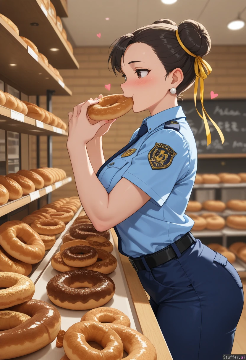 ((Highest quality, high resolution, hdr, uhd, 8k, incredible shading and lighting, high detail)) Location: 1 female, (solo), (Chun-li), (wearing police uniform, light blue police shirt, dark blue pants, black belt, no hat), (morbidly obese:.0), (gigantic fat belly:.0), (in bakery, eating donut, happy, blushing, hearts), (side view)