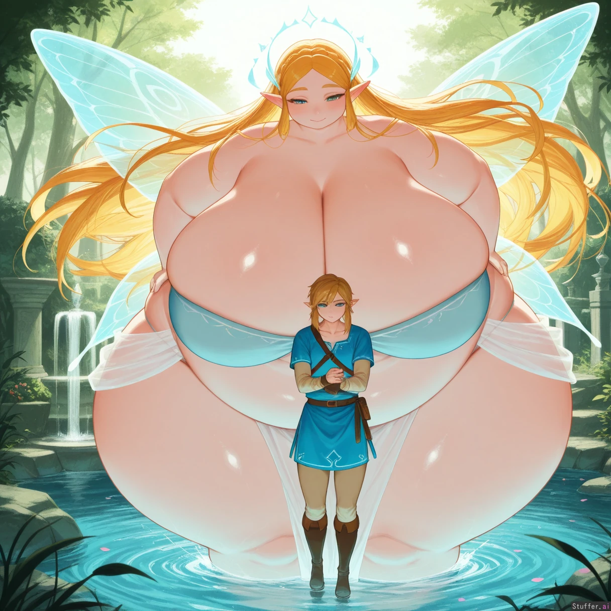 uhd, high resolution, flawless, best_quality, (usa37107692\(artist\):1.0), link, zelda, the legend of zelda, breath of the wild, botw, couple, romantic, love, close, looking at each other, smile, intimate, leaning in, great fairy zelda, fairy wings, translucent wings, glowing wings, magical aura, sparkles, (midair zelda, floating zelda,:0.9) ethereal, short hair, flowing hair, flower petals, vines, enchanted, fountain_garden, garden, water, stone_fountain, flowers, lush_vegetation, greenery, petals, outdoors, scenic_background, (morbidly_obese_girl:1.0), (Fat Arms:1.2), (gigantic_fat_thighs), (tall female), (gigantic sagging breasts:1.2), (enormous wide hips), (size diffrence:1.2), (revealing_clothes:1.0),