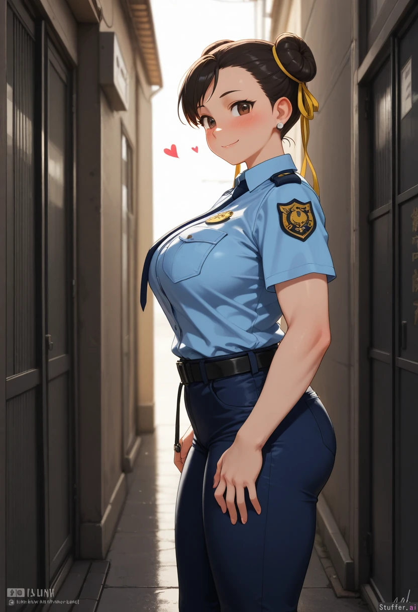 ((Highest quality, high resolution, hdr, uhd, 8k, incredible shading and lighting, high detail)) Location: 1 female, (solo), (Chun-li), (wearing police uniform, light blue police shirt, dark blue pants, black belt, no hat), (morbidly obese:.0), (gigantic fat belly:.0), (happy, blushing, hearts), (side view)