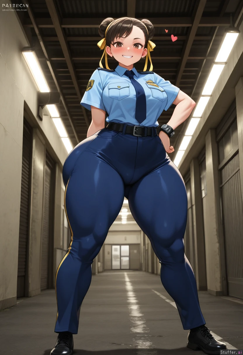 ((Highest quality, high resolution, hdr, uhd, 8k, incredible shading and lighting, high detail)) Location: 1 female, (solo), (Chun-li), (wearing police uniform, light blue police shirt, dark blue pants, black belt, no hat), (morbidly obese:.0), (gigantic fat belly:.0), (happy, blushing, hearts), wide_ass , mega legs
