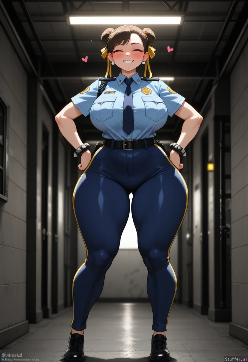 ((Highest quality, high resolution, hdr, uhd, 8k, incredible shading and lighting, high detail)) Location: 1 female, (solo), (Chun-li), (wearing police uniform, light blue police shirt, dark blue pants, black belt, no hat), (morbidly obese:.0), (gigantic fat belly:.0), (happy, blushing, hearts), wide_ass , mega legs,