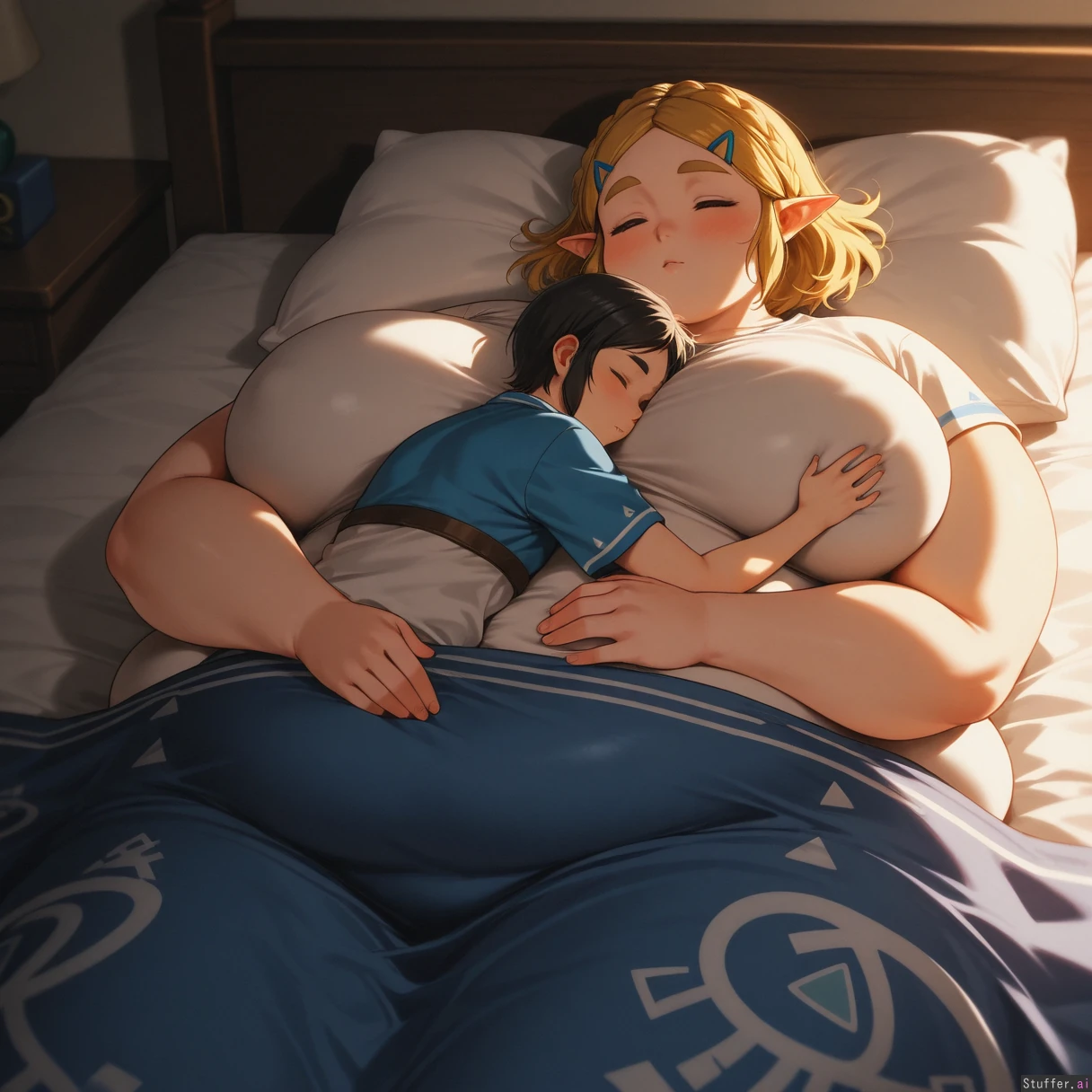 uhd, high resolution, flawless, best_quality, (maru_ccy:1.4) link (the legend of zelda), zelda (the legend of zelda), breath of the wild, botw, link x zelda, zelink, 1boy, 1girl, couple, hugging, cuddle, cuddling, embrace, lying, lying on bed, bed, indoors, bedroom, cozy, soft lighting, warm lighting, intimate, peaceful, relaxed, sleeping together, resting, blanket, sheets, pillow, close, affectionate, tender, calm atmosphere, night, quiet, comfort, together, side by side (morbidly_obese_girl:1.4), (Fat Arms:1.0), (gigantic_fat_thighs:1.0), (tall female), (gigantic sagging breasts), (enormous wide hips:1.0), (size diffrence:1.2), fully_clothed,