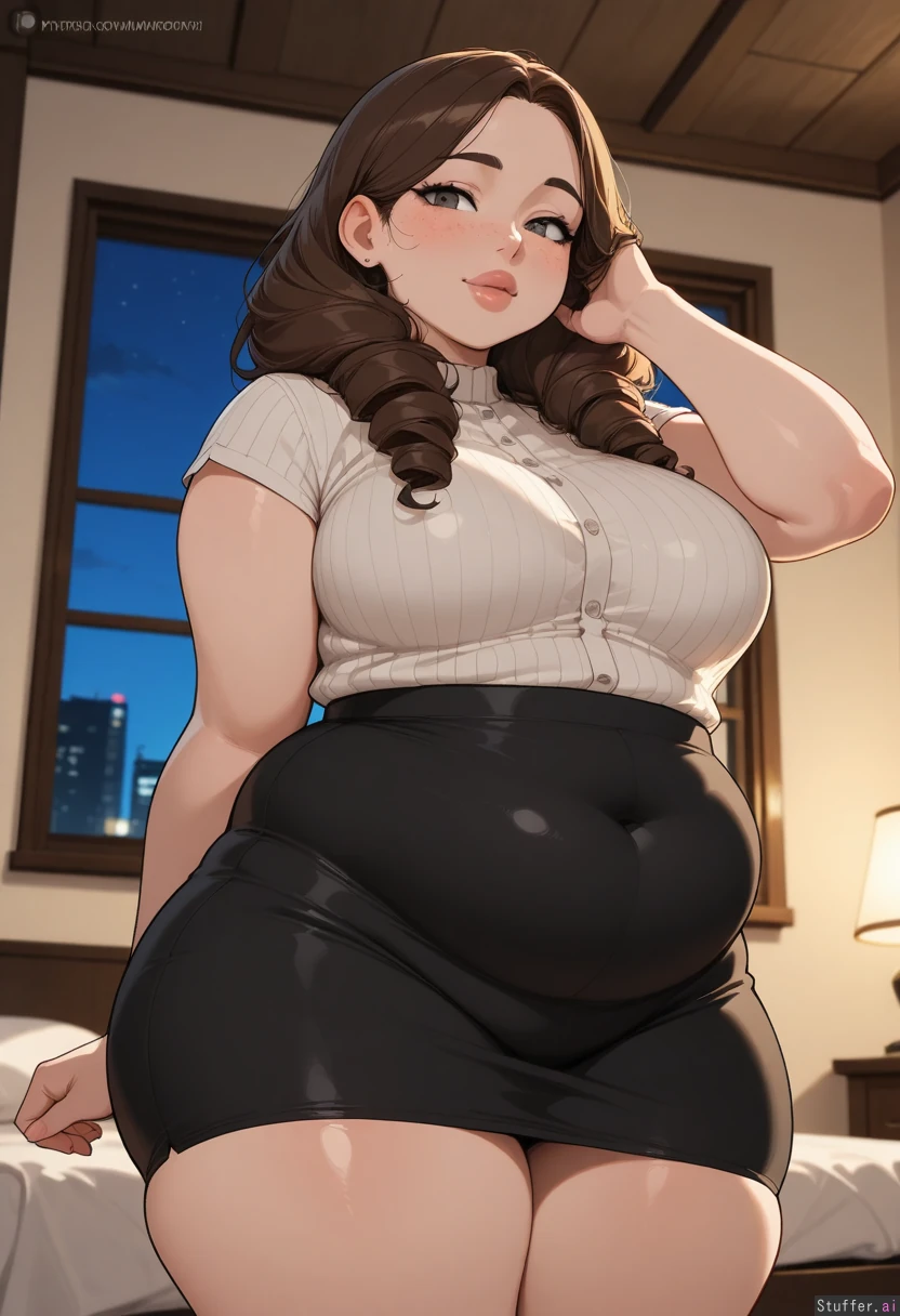 masterpiece, best quality, score_7. krekkov(artists), KAMII MOMORU(artist), beautiful shading, highly detailed, best quality, perfect anatomy, perfect proportions, perfect lighting, pawg, bottomheavy, pearshaped body, super thicc, mega juicy curves, hot girlfriend, overly full massive wide thick full bust, thighs are too fat to hide, (pretty milf, very large and wide, so fat, too thick, mature), stunning beauty, fertile woman, solo ((Vibrant brunette hair)), (curly hair), partially braided no-bangs), thick lips, chubby cheeks with big cheekbones, almond_shape gray eyes beautiful_eyes, looking at viewer, ((love gaze)), blushing, black eyeliner, caring, soft warm skin, body and face freckles, Long high-waist black pencil skirt and silk shirt shes too thick to fuck low angle making her look so breedable Bedroom, night, fantasy , adjusting hair, greatly showing how much she wants to be bred obese thicc skindentation, (Thick, plump), ( engorged round swollen fat firm medium breasts:0.4), Thick fat arms, chubby arms, soft beefy arms, slight burly, soft beefy, (Smooth Taught supple rounded girthy curve details), (very Wide hips:0.4) (enormous fat Thick flabby thighs:0.4) (plump sexy belly) (sexy bloaty inflation) (Navel outline, curve outlines), (Healthy bulk, deep innie navel, navel not pushed out, innie navel, covered navel), (Engorged, sexy inflation, swelling breasts), (Lust and Gluttony), (Expanding),