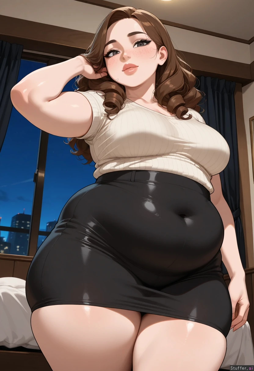 masterpiece, best quality, score_7. krekkov(artists), KAMII MOMORU(artist), beautiful shading, highly detailed, best quality, perfect anatomy, perfect proportions, perfect lighting, pawg, bottomheavy, pearshaped body, super thicc, mega juicy curves, hot girlfriend, overly full massive wide thick full bust, thighs are too fat to hide, (pretty milf, very large and wide, so fat, too thick, mature), stunning beauty, fertile woman, solo ((Vibrant brunette hair)), (curly hair), partially braided no-bangs), thick lips, chubby cheeks with big cheekbones, almond_shape gray eyes beautiful_eyes, looking at viewer, ((love gaze)), blushing, black eyeliner, caring, soft warm skin, body and face freckles, Long high-waist black pencil skirt and silk shirt shes too thick to fuck low angle making her look so breedable Bedroom, night, fantasy , adjusting hair, greatly showing how much she wants to be bred obese thicc skindentation, (Thick, plump), ( engorged round swollen fat firm medium breasts:0.4), Thick fat arms, chubby arms, soft beefy arms, slight burly, soft beefy, (Smooth Taught supple rounded girthy curve details), (very Wide hips:0.4) (enormous fat Thick flabby thighs:0.4) (plump sexy belly) (sexy bloaty inflation) (Navel outline, curve outlines), (Healthy bulk, deep innie navel, navel not pushed out, innie navel, covered navel), (Engorged, sexy inflation, swelling breasts), (Lust and Gluttony), (Expanding),