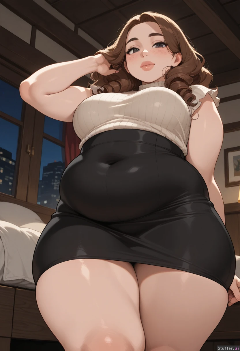 masterpiece, best quality, score_7. krekkov(artists), KAMII MOMORU(artist), beautiful shading, highly detailed, best quality, perfect anatomy, perfect proportions, perfect lighting, pawg, bottomheavy, pearshaped body, super thicc, mega juicy curves, hot girlfriend, overly full massive wide thick full bust, thighs are too fat to hide, (pretty milf, very large and wide, so fat, too thick, mature), stunning beauty, fertile woman, solo ((Vibrant brunette hair)), (curly hair), partially braided no-bangs), thick lips, chubby cheeks with big cheekbones, almond_shape gray eyes beautiful_eyes, looking at viewer, ((love gaze)), blushing, black eyeliner, caring, soft warm skin, body and face freckles, Long high-waist black pencil skirt and silk shirt shes too thick to fuck low angle making her look so breedable Bedroom, night, fantasy , adjusting hair, greatly showing how much she wants to be bred obese thicc skindentation, (Thick, plump), ( engorged round swollen fat firm medium breasts:0.4), Thick fat arms, chubby arms, soft beefy arms, slight burly, soft beefy, (Smooth Taught supple rounded girthy curve details), (very Wide hips:0.4) (enormous fat Thick flabby thighs:0.4) (plump sexy belly) (sexy bloaty inflation) (Navel outline, curve outlines), (Healthy bulk, deep innie navel, navel not pushed out, innie navel, covered navel), (Engorged, sexy inflation, swelling breasts), (Lust and Gluttony), (Expanding),