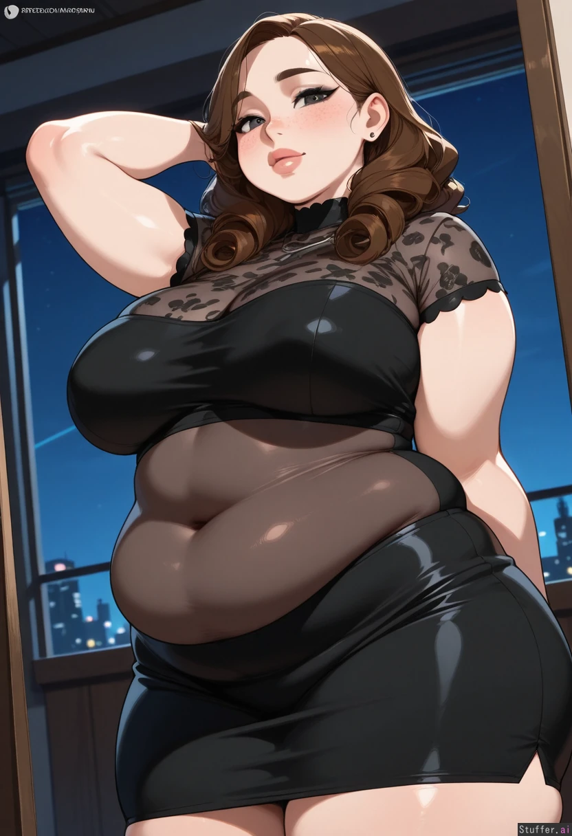 masterpiece, best quality, score_7. krekkov(artists), KAMII MOMORU(artist), beautiful shading, highly detailed, best quality, perfect anatomy, perfect proportions, perfect lighting, pawg, bottomheavy, pearshaped body, super thicc, mega juicy curves, hot girlfriend, overly full massive wide thick full bust, thighs are too fat to hide, (pretty milf, very large and wide, so fat, too thick, mature), stunning beauty, fertile woman, solo ((Vibrant brunette hair)), (curly hair), partially braided no-bangs), thick lips, chubby cheeks with big cheekbones, almond_shape gray eyes beautiful_eyes, looking at viewer, ((love gaze)), blushing, black eyeliner, caring, soft warm skin, body and face freckles, Long high-waist black pencil skirt and silk shirt shes too thick to fuck low angle making her look so breedable Bedroom, night, fantasy , adjusting hair, greatly showing how much she wants to be bred obese thicc skindentation, (Thick, plump), ( engorged round swollen fat firm medium breasts:0.4), Thick fat arms, chubby arms, soft beefy arms, slight burly, soft beefy, (Smooth Taught supple rounded girthy curve details), (very Wide hips:0.4) (enormous fat Thick flabby thighs:0.4) (plump sexy belly) (sexy bloaty inflation) (Navel outline, curve outlines), (Healthy bulk, deep innie navel, navel not pushed out, innie navel, covered navel), (Engorged, sexy inflation, swelling breasts), (Lust and Gluttony), (Expanding),