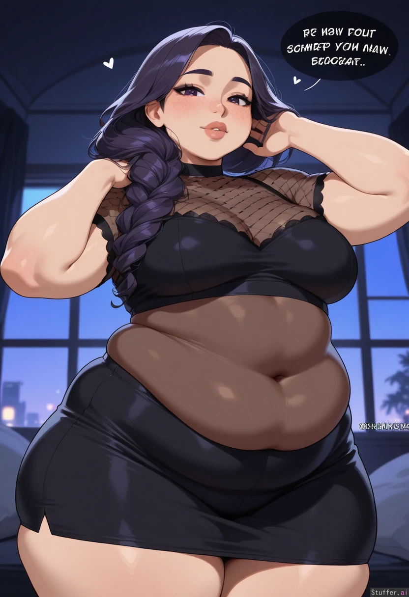 masterpiece, best quality, score_7. krekkov(artists), KAMII MOMORU (artist), beautiful shading, highly detailed, best quality, perfect anatomy, perfect proportions, perfect lighting, pawg, bottomheavy, pearshaped body, super thicc, mega juicy curves, hot girlfriend, overly full massive wide thick full bust, thighs are too fat to hide, (pretty milf, very large and wide, so fat, too thick, mature), stunning beauty, fertile woman, solo ((Vibrant dark_purple hair)), (curly hair), partially braided no-bangs), thick lips, chubby cheeks with big cheekbones, almond_shape purple eyes beautiful_eyes, looking at viewer, ((love gaze)), blushing, black eyeliner, caring, warm brown skin, body and face freckles, Long high-waist black pencil skirt and silk shirt shes too thick to fuck low angle making her look so breedable Bedroom, night, fantasy , adjusting hair, greatly showing how much she wants to be bred obese thicc skindentation, (Thick, plump), ( engorged round swollen fat firm medium breasts:0.4), Thick fat arms, chubby arms, soft beefy arms, slight burly, soft beefy, (Smooth Taught supple rounded girthy curve details), (very Wide hips:0.4) (enormous fat Thick flabby thighs:0.4) (plump sexy belly) (sexy bloaty inflation) (Navel outline, curve outlines), (Healthy bulk, deep innie navel, navel not pushed out, innie navel, covered navel), (Engorged, sexy inflation, swelling breasts), (Lust and Gluttony), (Expanding),