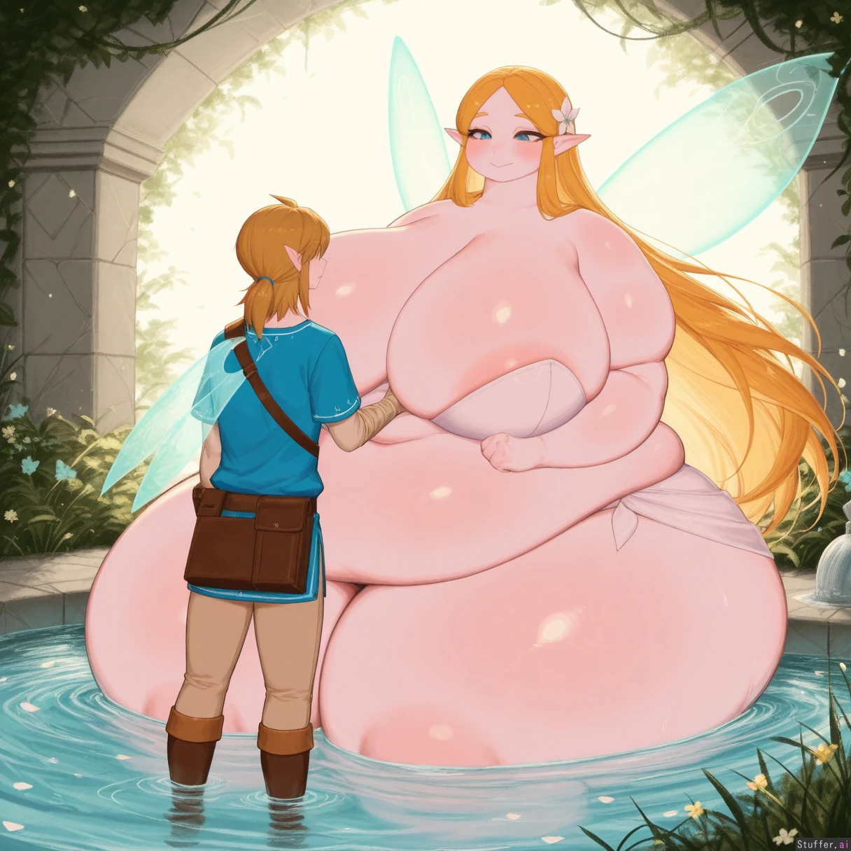 uhd, high resolution, flawless, best_quality, (usa37107692\(artist\):1.6), link, zelda, the legend of zelda, breath of the wild, botw, couple, romantic, love, close, looking at each other, smile, intimate, leaning in, great fairy zelda, fairy wings, translucent wings, glowing wings, magical aura, sparkles, (midair zelda, floating zelda,:0.9) ethereal, short hair, flowing hair, flower petals, vines, enchanted, fountain_garden, garden, water, stone_fountain, flowers, lush_vegetation, greenery, petals, outdoors, scenic_background, (morbidly_obese_girl:1.0), (Fat Arms:1.2), (gigantic_fat_thighs), (tall female), (gigantic sagging breasts:1.2), (enormous wide hips), (size diffrence:1.2), (revealing_clothes:1.0),