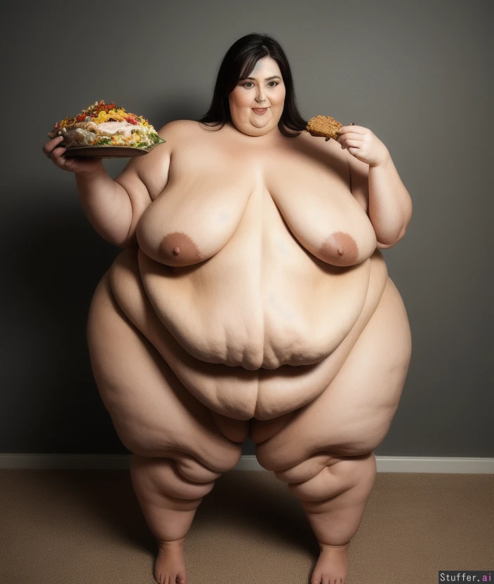 -Full body view of a gorgeous naked woman standing -squishy obesity monster expanding inside her -healthy food feeds the obesity monster larger inside her -unavoidable obesity -her soft squishy fat is a monster inside her