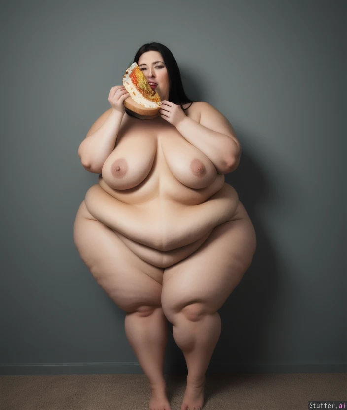 -Full body view of a gorgeous naked woman standing -she eats to feed the super obese monster fat expanding inside her -mythical soft squishy obese hungry monster fat inside woman