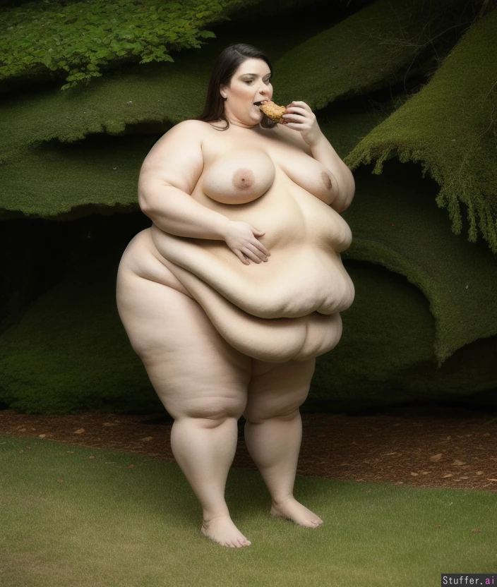 -Full body view of a gorgeous naked woman standing -she eats to feed the super obese monster fat expanding inside her -mythical soft squishy obese hungry monster fat inside woman