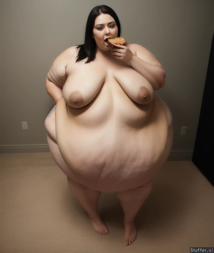 -Full body view of a gorgeous naked woman standing -she eats to feed the super obese monster fat expanding inside her -mythical soft squishy obese hungry monster fat inside woman -jumbo wobbly super obese monster fat stuffed inside woman