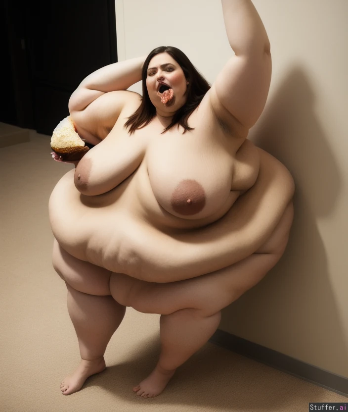 -Full body view of a gorgeous naked woman standing -she eats to feed the super obese fat monster expanding inside her -super wobbly obese blob monster stretching the woman to fit inside her -fat blob monster expanding inside beautiful woman