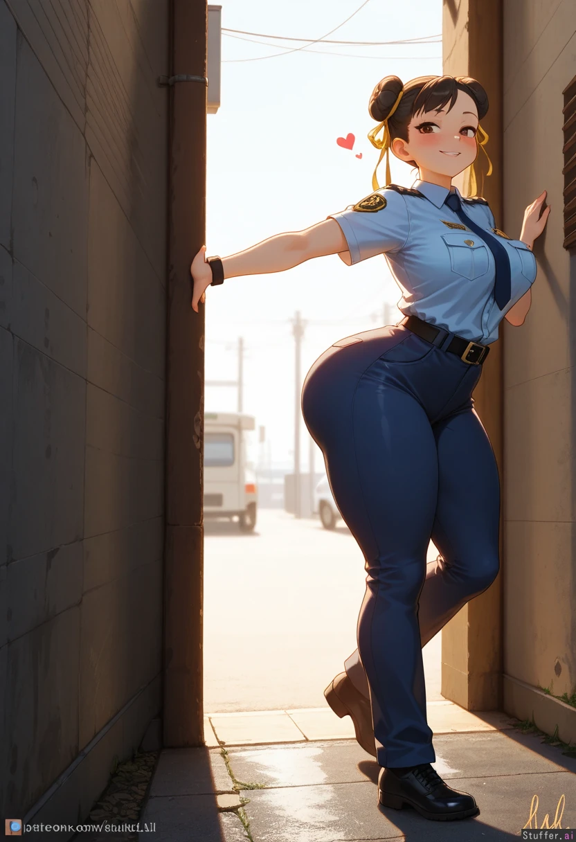 ((Highest quality, high resolution, hdr, uhd, 8k, incredible shading and lighting, high detail)) Location: 1 female, (solo), (Chun-li), (wearing police uniform, light blue police shirt, dark blue pants, black belt, no hat), (morbidly obese:.0), (gigantic fat belly:.0), (happy, blushing, hearts), wide_ass , mega legs, Stretching his pants
