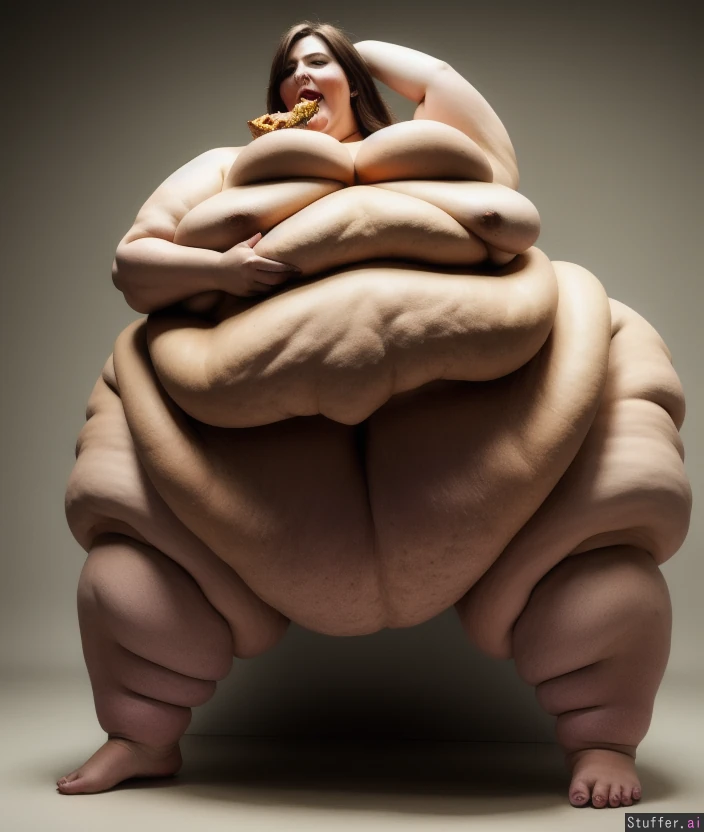 -Full body view of a gorgeous naked woman standing -she eats to feed the super obese fat monster expanding inside her -super wobbly obese blob monster stretching the woman to fit inside her -fat blob monster expanding inside beautiful woman