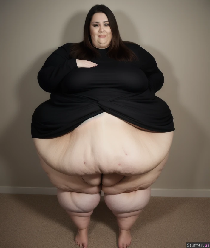 -Full body view of a beautiful naked woman standing -super obese fat blob expanding inside woman body -woman is super accommodating and bulges easily