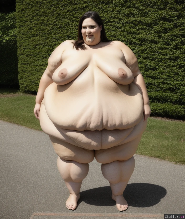 -Full body view of a beautiful naked woman standing -super obese fat blob expanding inside woman body -woman is super accommodating and bulges easily