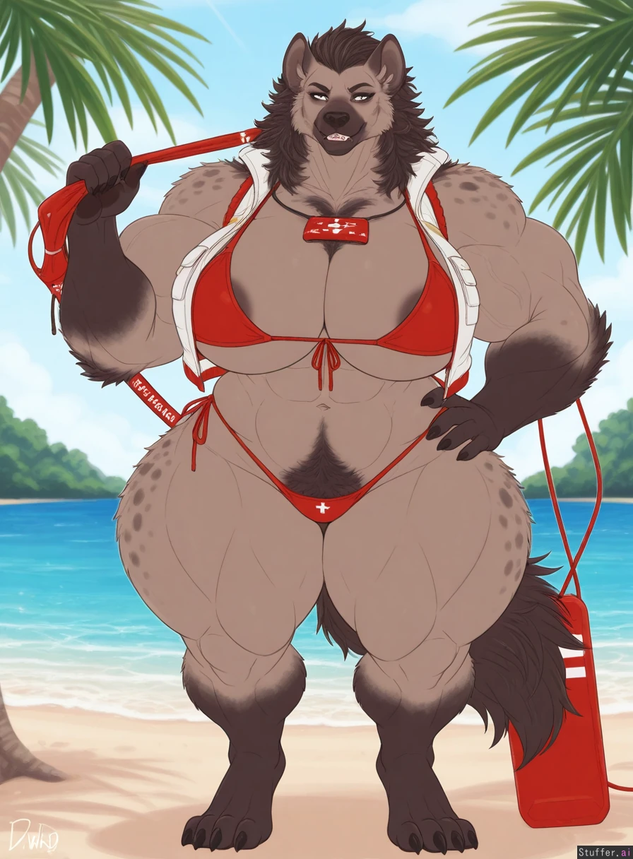 masterpiece, best quality, score_7. masterpiece, best quality, (((flat colors, simple shading, pronounced angles, overexaggerated features, sharp angles, solo, dimwitdog(artist)))), (small head), ((giant muscles, giant proportions, (hyper muscular hyper thick) hyper bulky female body:1.6, very large wide build, hyper thick hips)), hot and steamy and hot and bothered, ((tall adult female werehyena, red bikini with lifeguard vest, slutty eyeshadow)), plantigrade werehyena claws, werehyena snout, werehyena snout, aggressively transforming into a feral werehyena, transformation is ripping her clothes, ((pure brown spotted werehyena wild fur, detailed pure brown bushy wild fur:1.6, werehyena mane, white eyes, massive pubic_hair_peek)), (standing seductively on beach, seductively touching her body, hand on hip), (slutty eyeshadow, hot and bothered), (side angle)