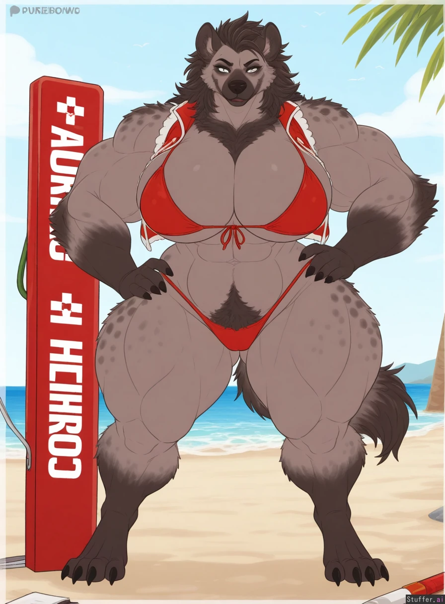 masterpiece, best quality, score_7. masterpiece, best quality, (((flat colors, simple shading, pronounced angles, overexaggerated features, sharp angles, solo, dimwitdog(artist)))), (small head), ((giant muscles, giant proportions, (hyper muscular hyper thick) hyper bulky female body:1.6, very large wide build, hyper thick hips)), hot and steamy and hot and bothered, ((tall adult female werehyena, red bikini with lifeguard vest, slutty eyeshadow)), plantigrade werehyena claws, werehyena snout, werehyena snout, aggressively transforming into a feral werehyena, transformation is ripping her clothes, ((pure brown spotted werehyena wild fur, detailed pure brown bushy wild fur:1.6, werehyena mane, white eyes, massive pubic_hair_peek)), (standing seductively on beach, seductively touching her body, hand on hip), (slutty eyeshadow, hot and bothered), (side angle)