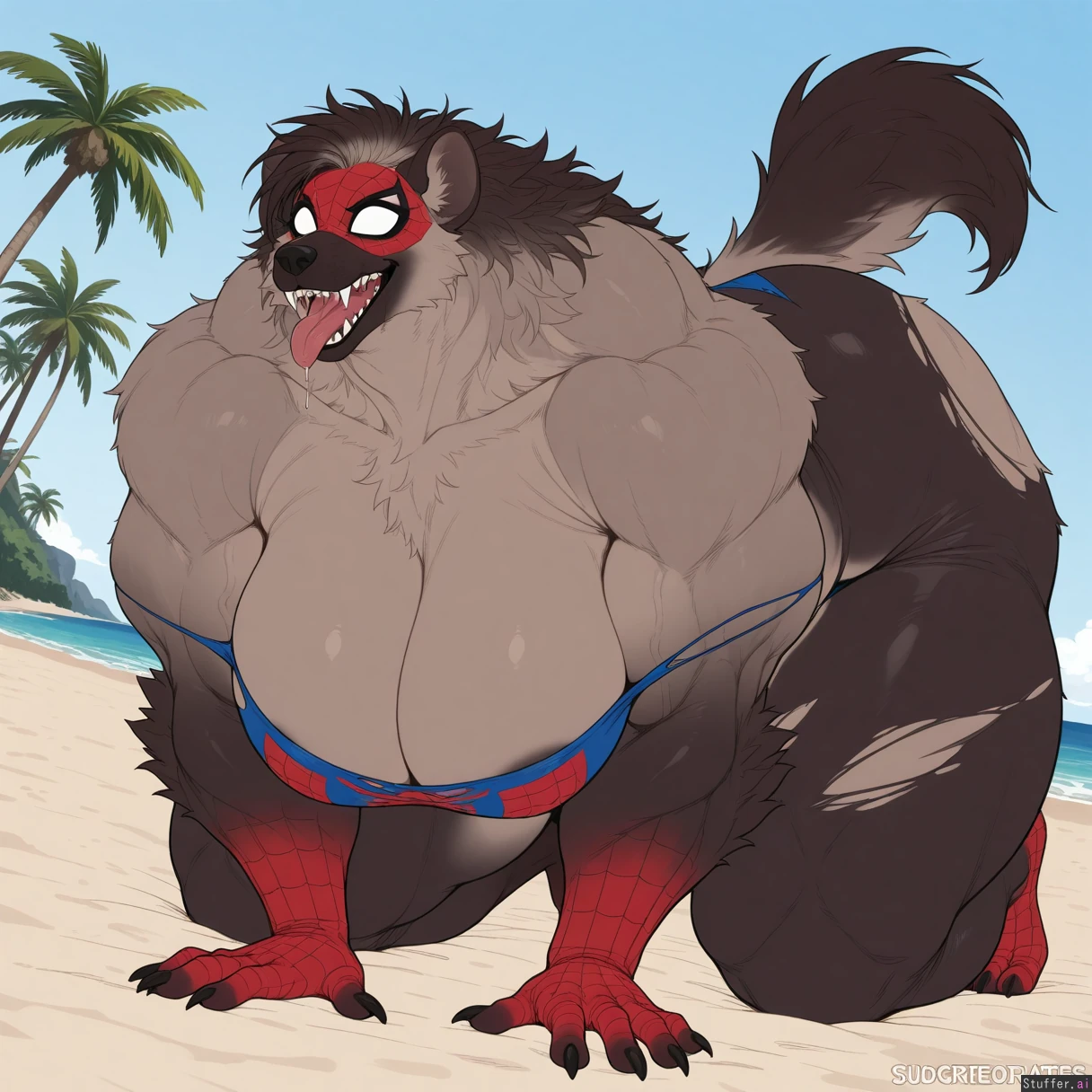 masterpiece, best quality, score_7. masterpiece, best quality, (((flat colors, simple shading, pronounced angles, overexaggerated features, sharp angles, solo))), (small head), ((giant muscles, giant proportions, (hyper muscular hyper thick) hyper bulky female body:1.6, very large wide build, hyper thick hips)), hot and steamy and hot and bothered, ((tall adult female werehyena spider-man, accurate torn red and blue spider-man suit, slutty eyeshadow, spider-man mask)), plantigrade werehyena claws, werehyena snout, werehyena snout, aggressively transforming into a feral werehyena, torn_clothes, pure brown spotted werehyena wild fur, detailed pure brown bushy wild fur:1.6, werehyena mane, white eyes, massive pubic_hair_peek, (seductively on beach on all fours, seductively touching her body, tongue hanging out of mouth, drooling), (slutty eyeshadow, hot and bothered), (side angle)