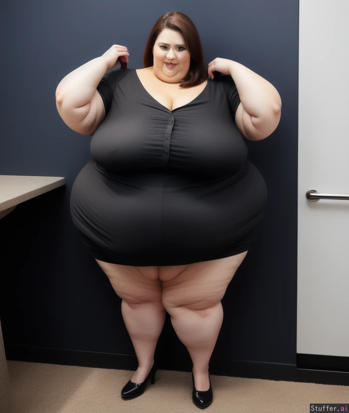 -Full body view of a beautiful naked secretary woman standing -beautiful sexy super obese piggy woman -monster blob fat showing in tight dress -all squishy soft blob fat