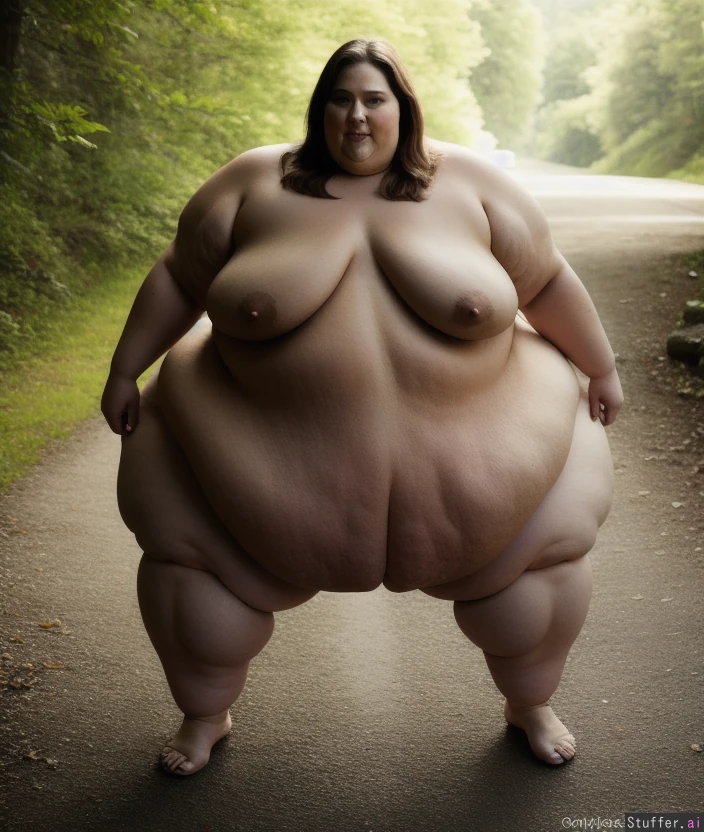 -Full body view of a beautiful naked woman standing -super obese sized monster fat blob expanding inside her body -saggy obese body with slim face