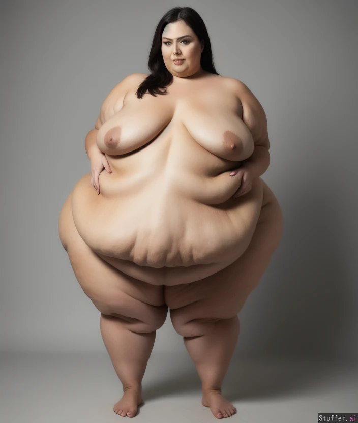 -Full body view of a beautiful naked woman standing -super obese sized monster fat blob expanding inside her body -sagging obese body with slim face