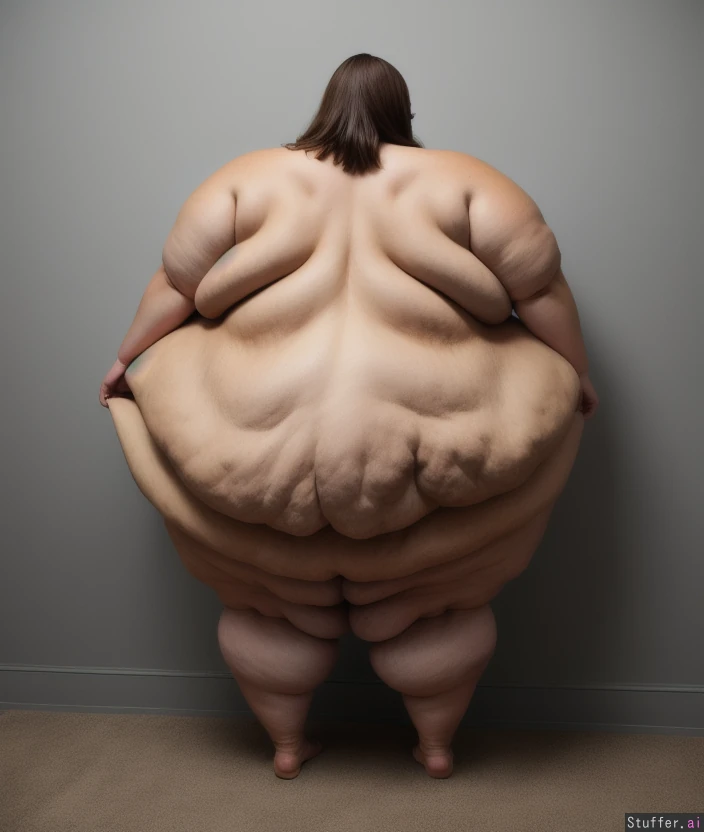 -Full body view of a beautiful naked woman standing -super obese sized monster fat blob expanding inside her body -sagging naked obese monster body with slim face