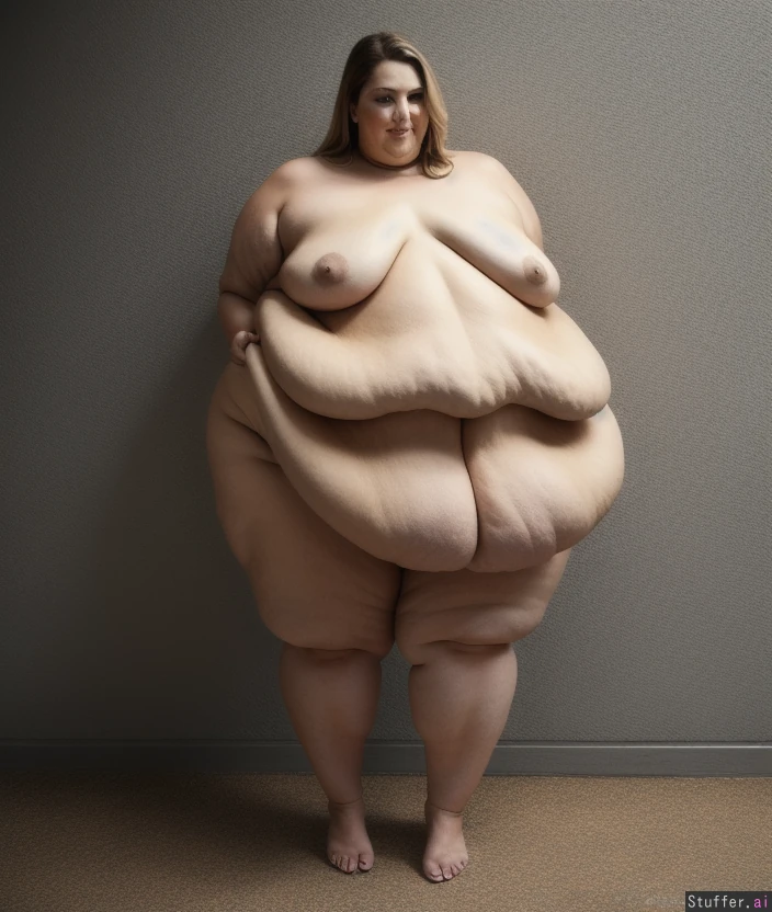 -Full body view of a beautiful naked woman standing -super obese sized monster fat blob expanding inside her body -sagging naked obese monster body with slim face