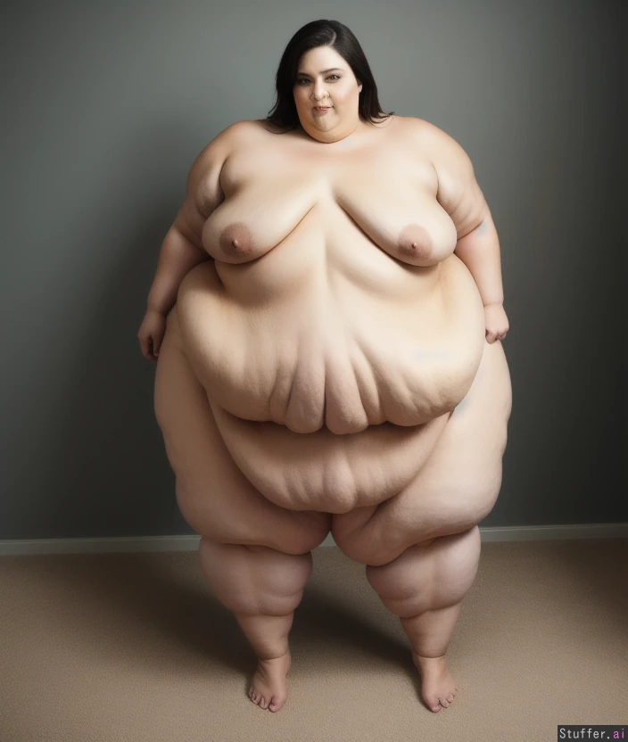 -Full body view of a beautiful naked woman standing -super obese sized monster fat blob expanding inside her body -sagging naked obese monster body with slim face -heavy ugh sexy obesity