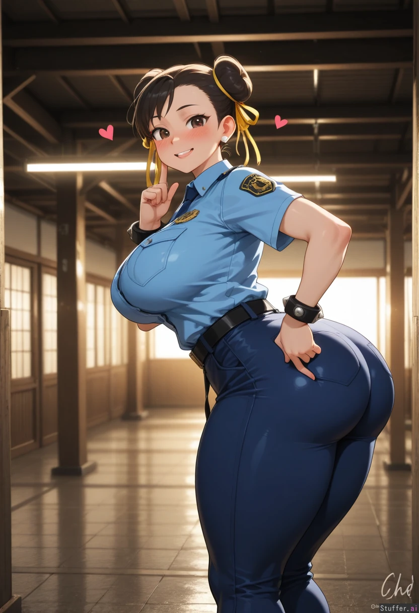((Highest quality, high resolution, hdr, uhd, 8k, incredible shading and lighting, high detail)) Location: 1 female, (solo), (Chun-li), (wearing police uniform, light blue police shirt, dark blue pants, black belt, no hat), (morbidly obese:.0), (gigantic fat belly:.0), (happy, blushing, hearts), wide_ass , mega legs, Adjusting his pants